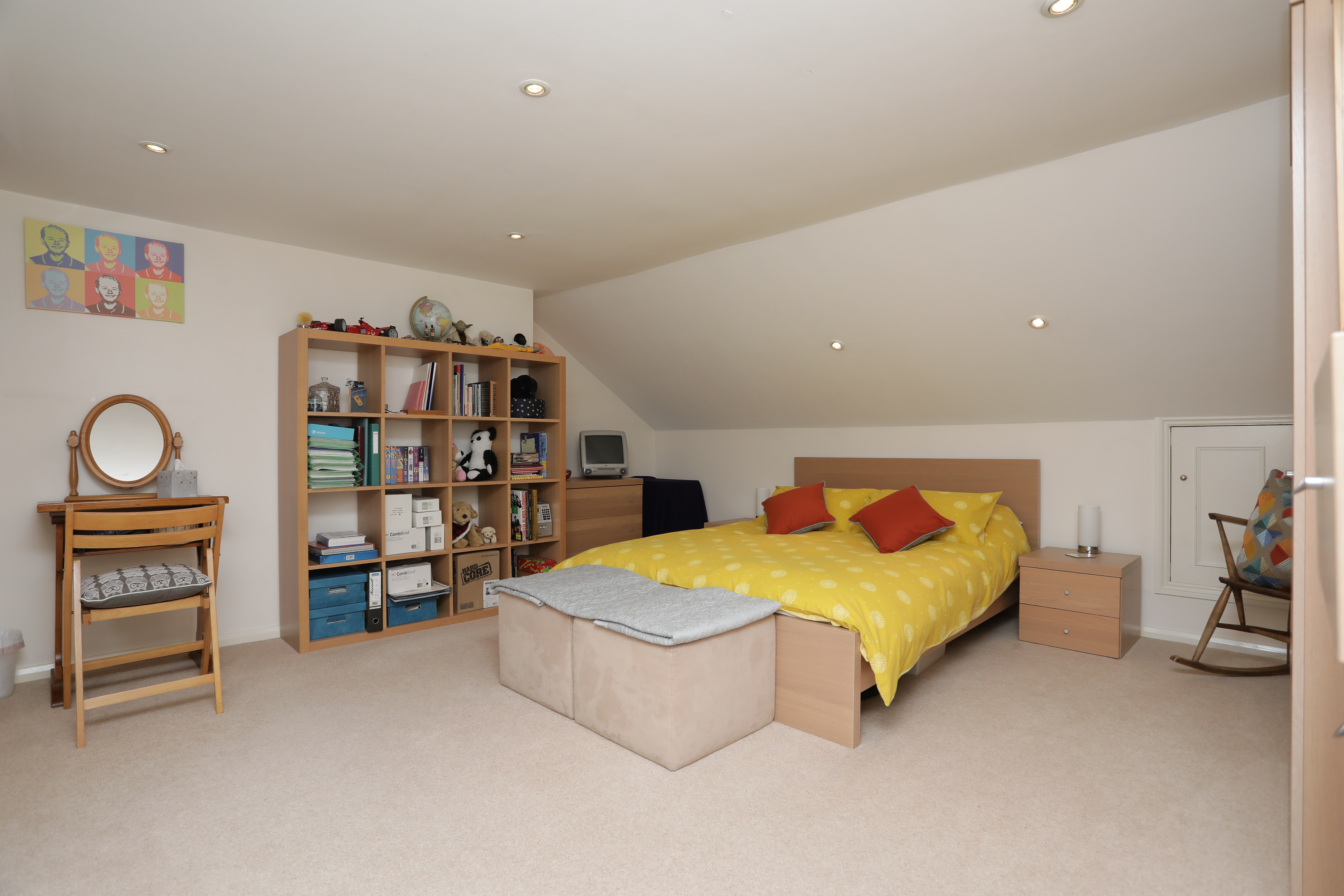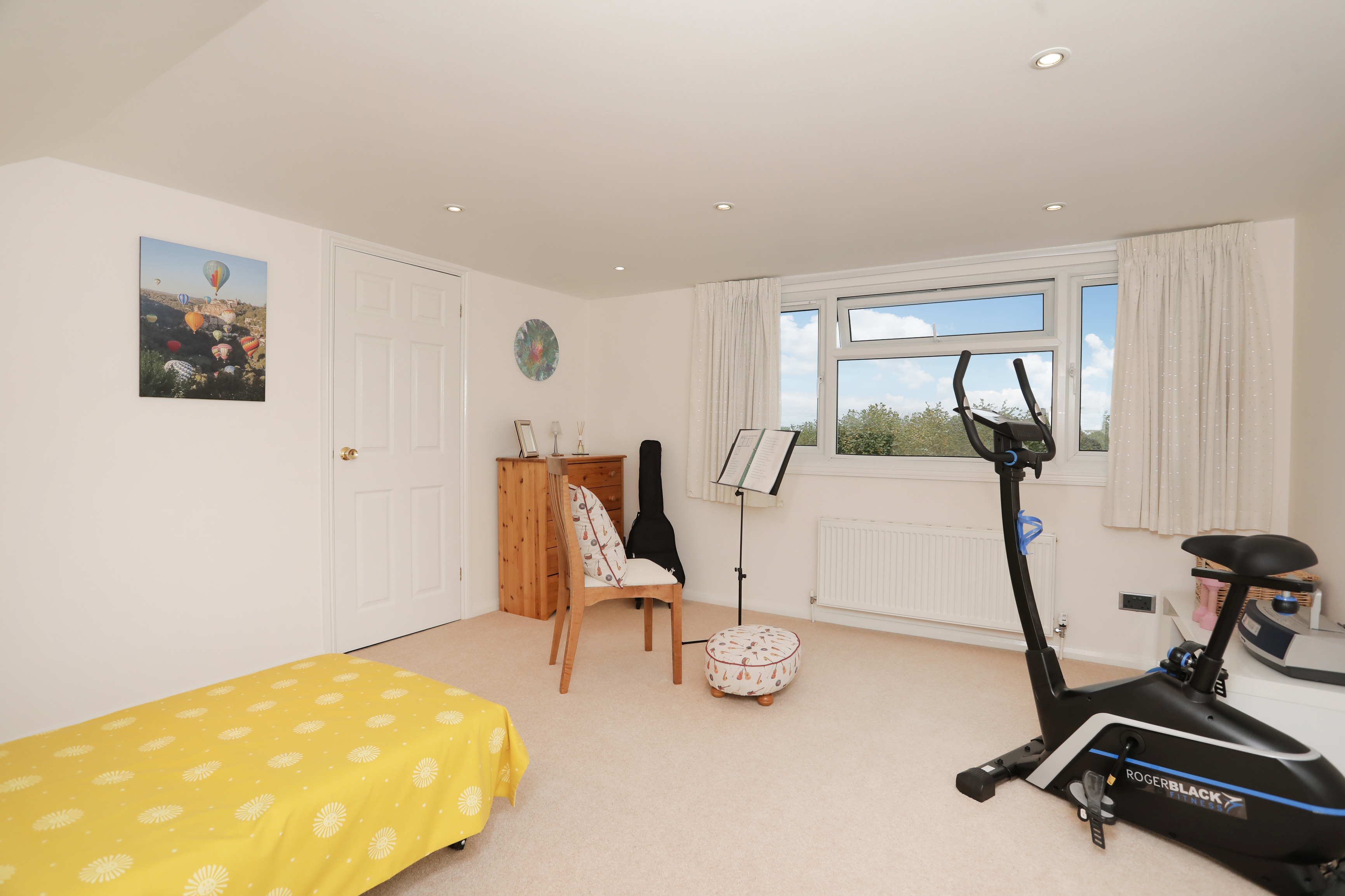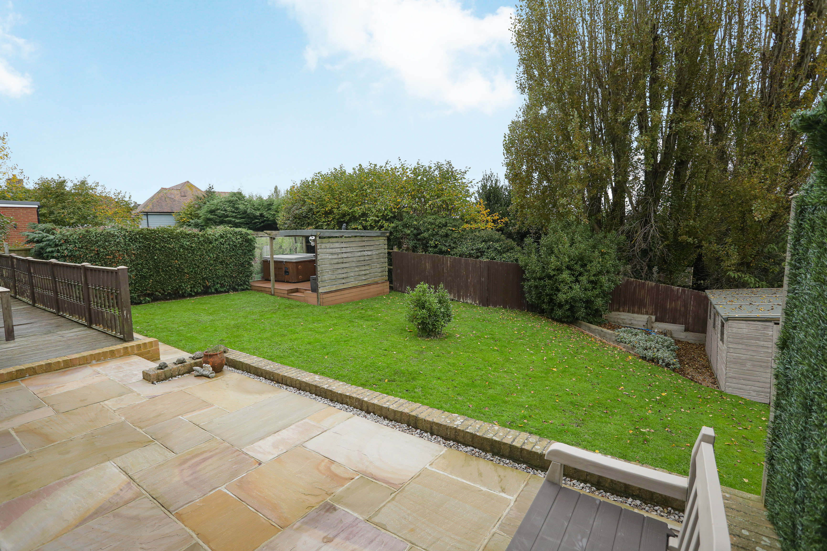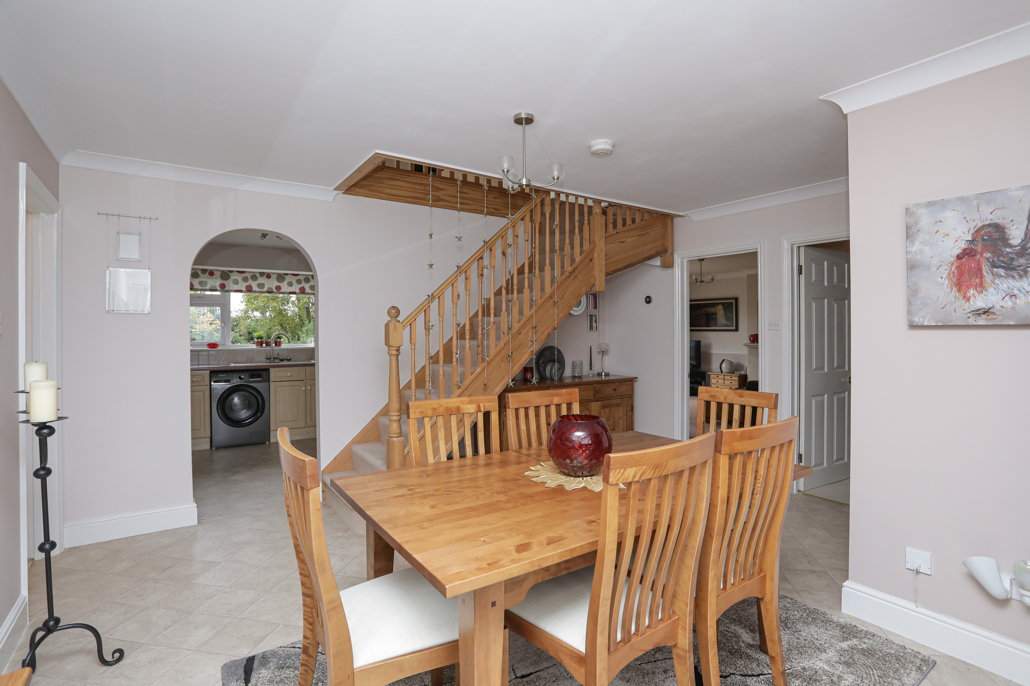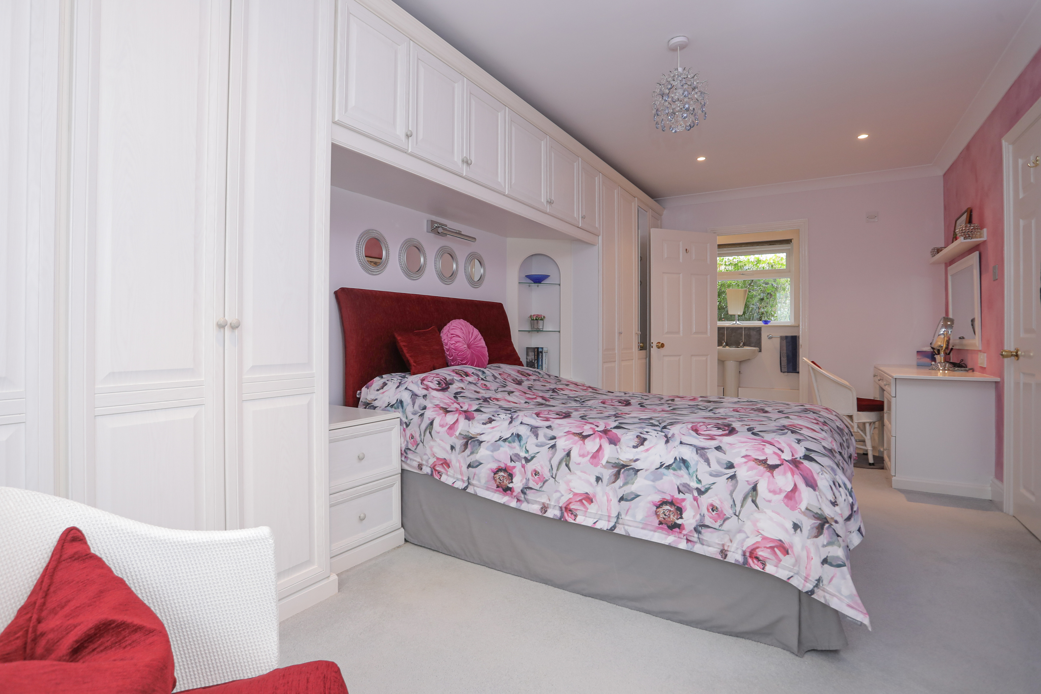 The chalet bungalow features five well-sized bedrooms, with three on the ground floor of which one is currently used as a study. The remaining bedrooms upstairs offer additional privacy, with ample natural light and generous storage. A large, open-plan dining area creates an inviting hub for family gatherings and entertaining, while the kitchen combines style with practicality, equipped with modern appliances and an efficient layout. Outside, the beautifully landscaped south-westerly facing garden and sandstone patio area, provides a serene space to relax or enjoy al fresco dining including a dedicated hot-tub area. To the front, there is a large driveway for multiple cars and a garage which benefits from an extended canopy.