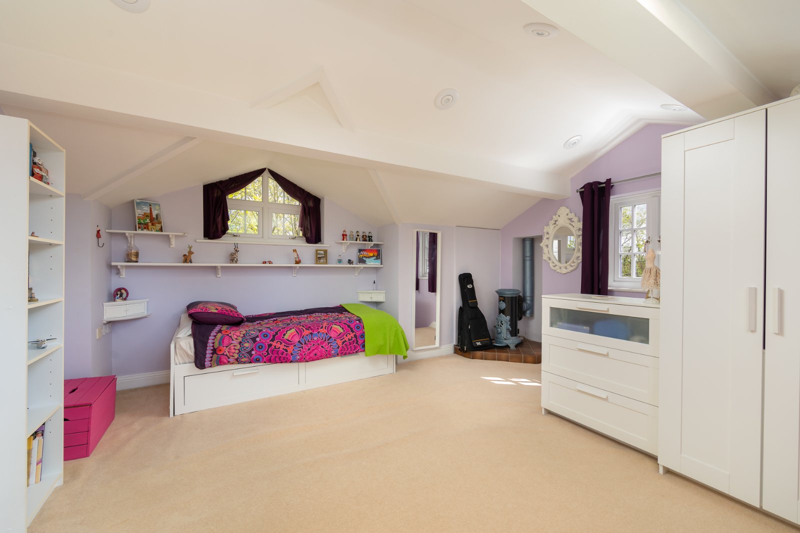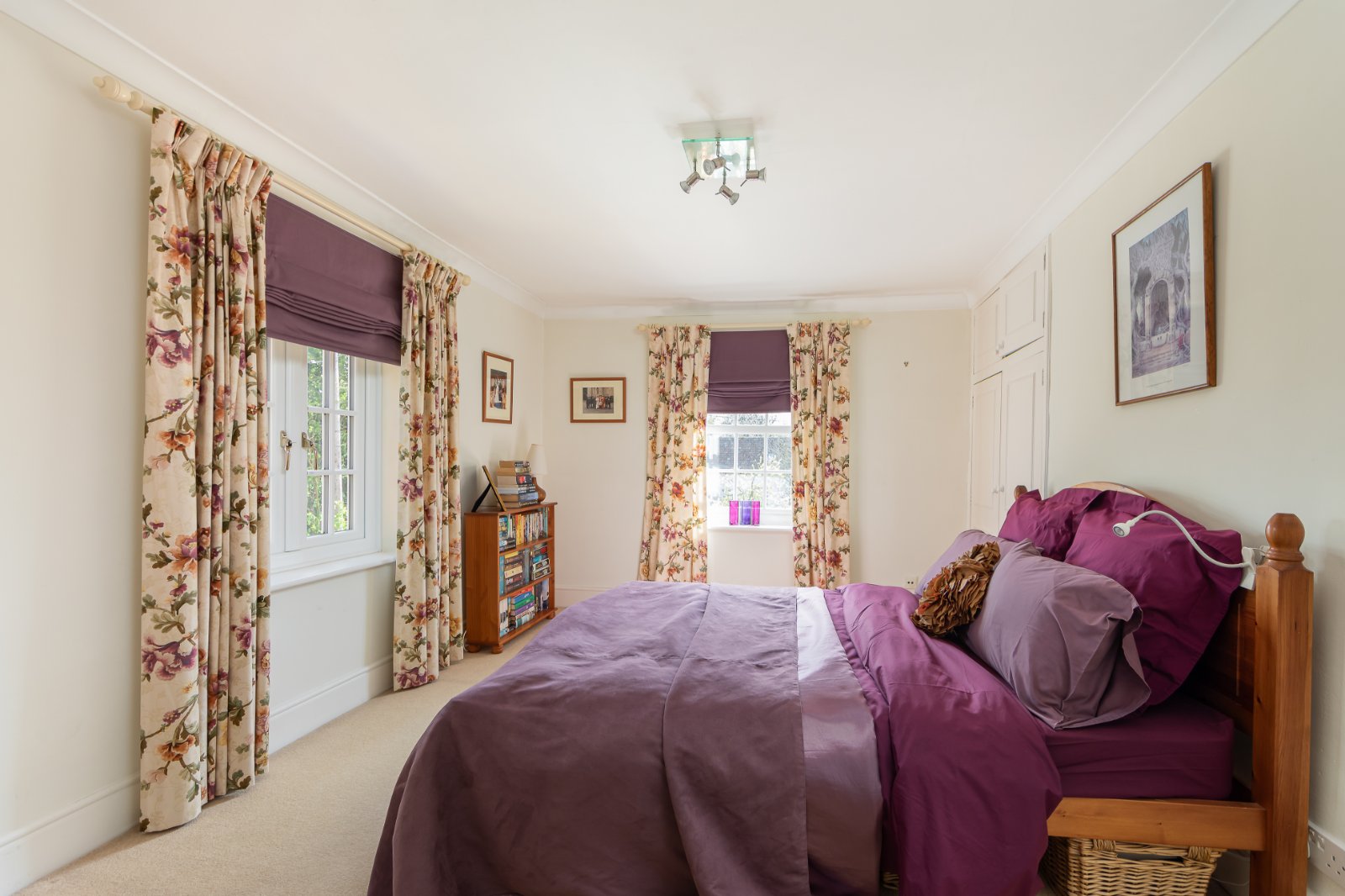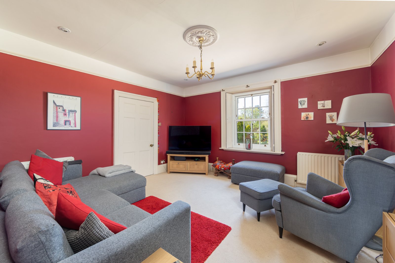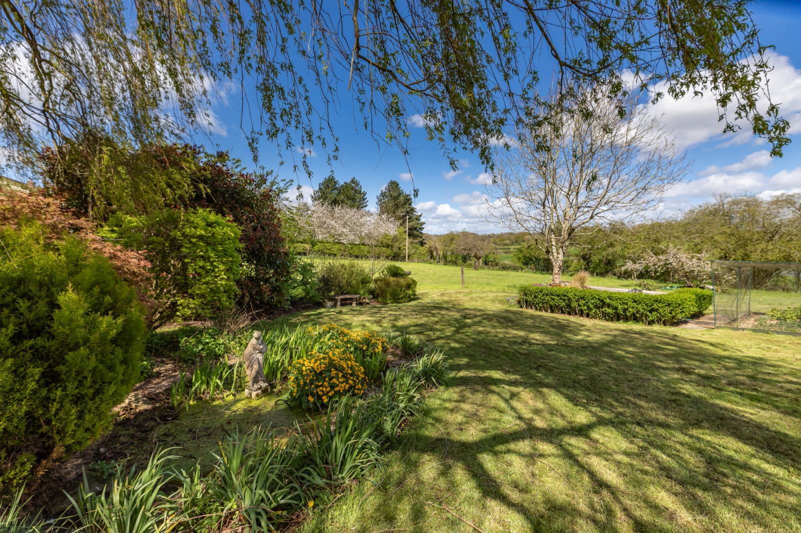 The semicircular staircase leads to the first floor, where the principal bedroom features an en suite with a roll-top bath and separate shower. Three further double bedrooms offer picturesque views of the countryside.