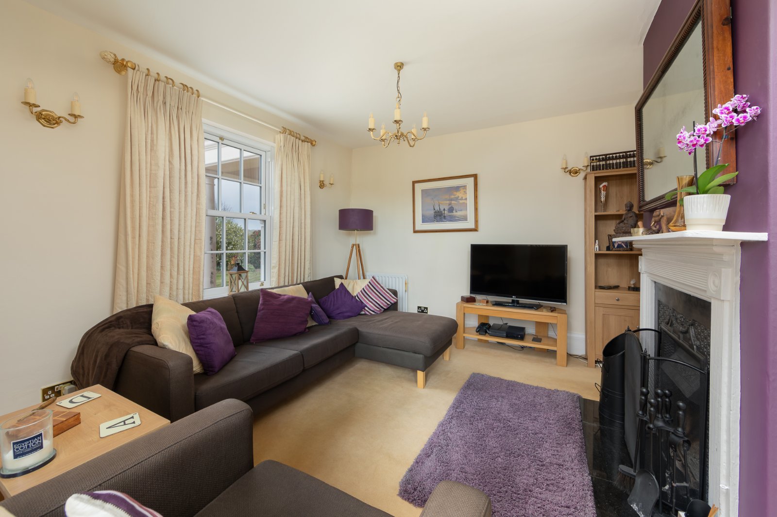 The sitting/dining room, bathed in sunlight through a large bay window, features two striking back-to-back fireplaces, one housing a wood burner and the other an open fire with cast iron surround. The kitchen, installed in 2019, combines functionality with character, boasting original beams, a Belling range oven, and a breakfast bar. Additional ground-floor accommodation includes a family room, study, utility, boot room, and a converted studio offering versatile use.