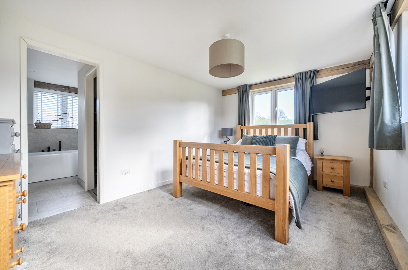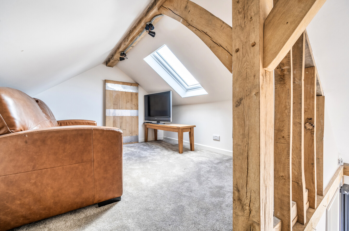The ground floor offers a generous, characterful sitting room centred around the inglenook fireplace, together with an attractive open plan kitchen/dining room featuring a vaulted ceiling and striking trifold doors opening onto the gardens. A mezzanine-level breakout area provides a versatile and welcoming space, ideal for informal seating, relaxation, or additional living/work-from-home use, overlooking the main floor below. A ground floor bedroom provides excellent convenience, complete with dressing room and an en suite shower room.