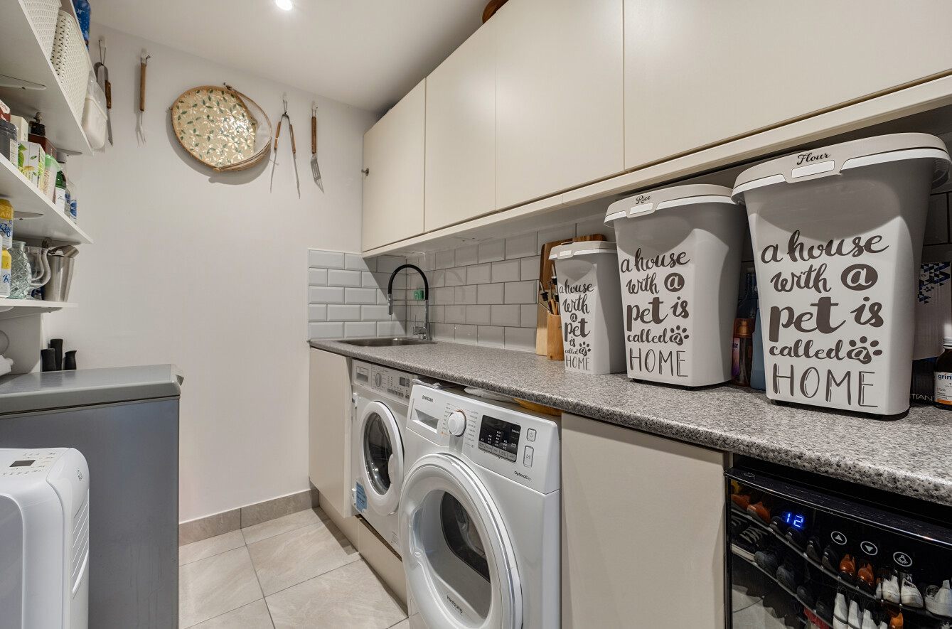 The living accommodation includes a stylish and well-planned fitted kitchen with a range of sleek wall and base units. The former garage has been thoughtfully converted to create an additional reception room and a practical utility room, complementing the sitting room located to the front of the property.