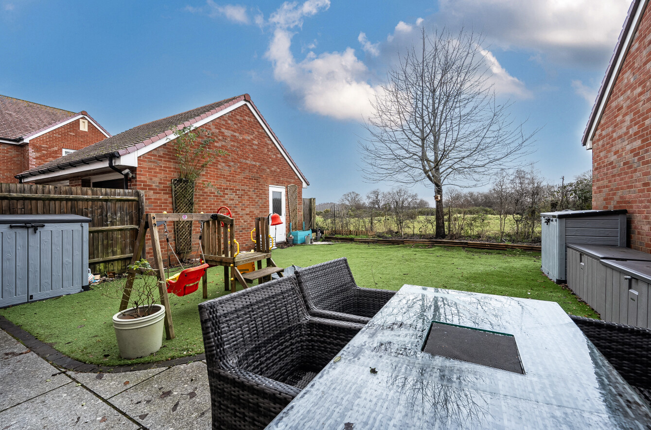 Outside, the rear garden provides a private, low-maintenance haven with a sunny aspect, featuring an artificial lawn, patio area, and access to both the garage and the front of the property. To the front, a generous driveway offers parking for multiple vehicles.