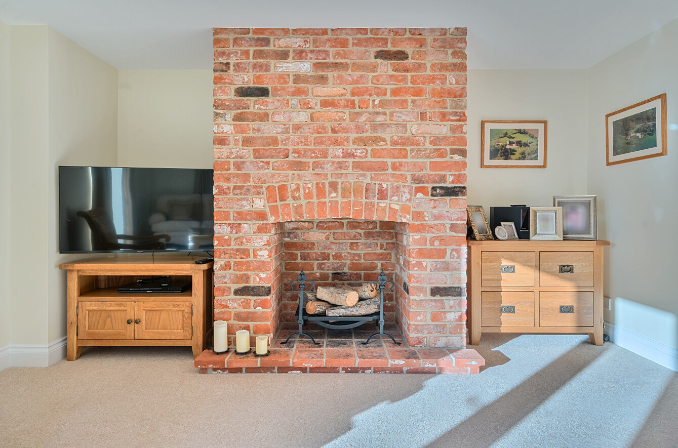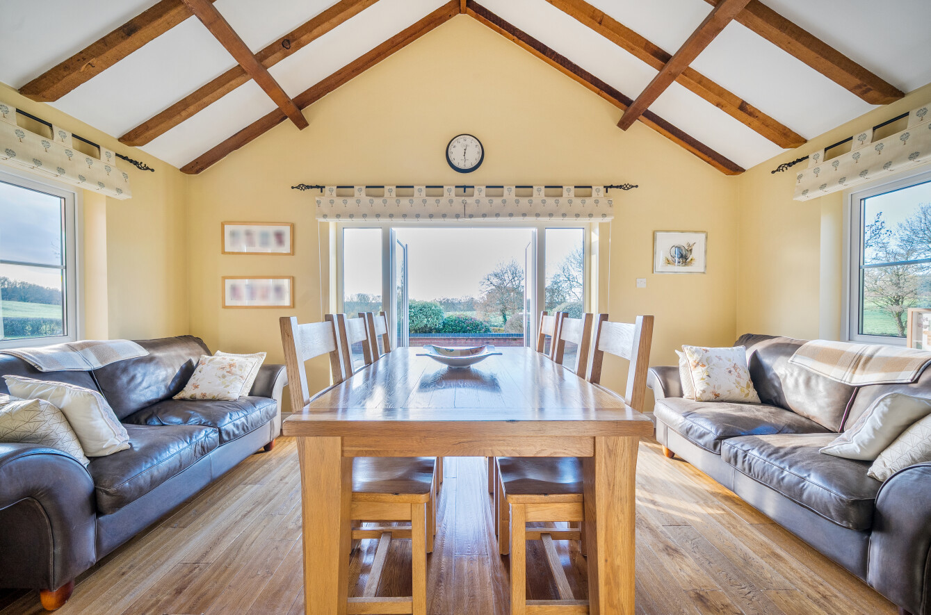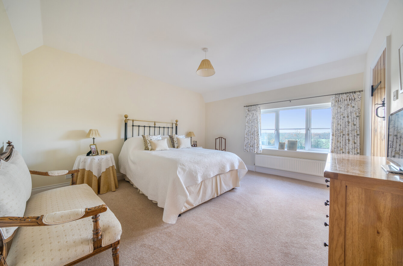 Inside, the current owners have carried out a meticulous renovation, retaining architectural character while updating the spaces to a high standard. The main hallway provides a warm welcome and flows naturally into the ground-floor accommodation. The handmade kitchen, complete with a separate utility area, leads into a dining area capped by a vaulted ceiling to the rear, from there, doors open onto a generous rear patio. This patio acts as a sun trap and enjoys views over the surrounding land, making it ideal for alfresco meals or entertaining. The dining area delivers sweeping 180-degree vistas across the property’s own land and neighbouring farmland, while the living room, with its open fireplace and west-facing aspect, provides a cosy yet expansive space to unwind.