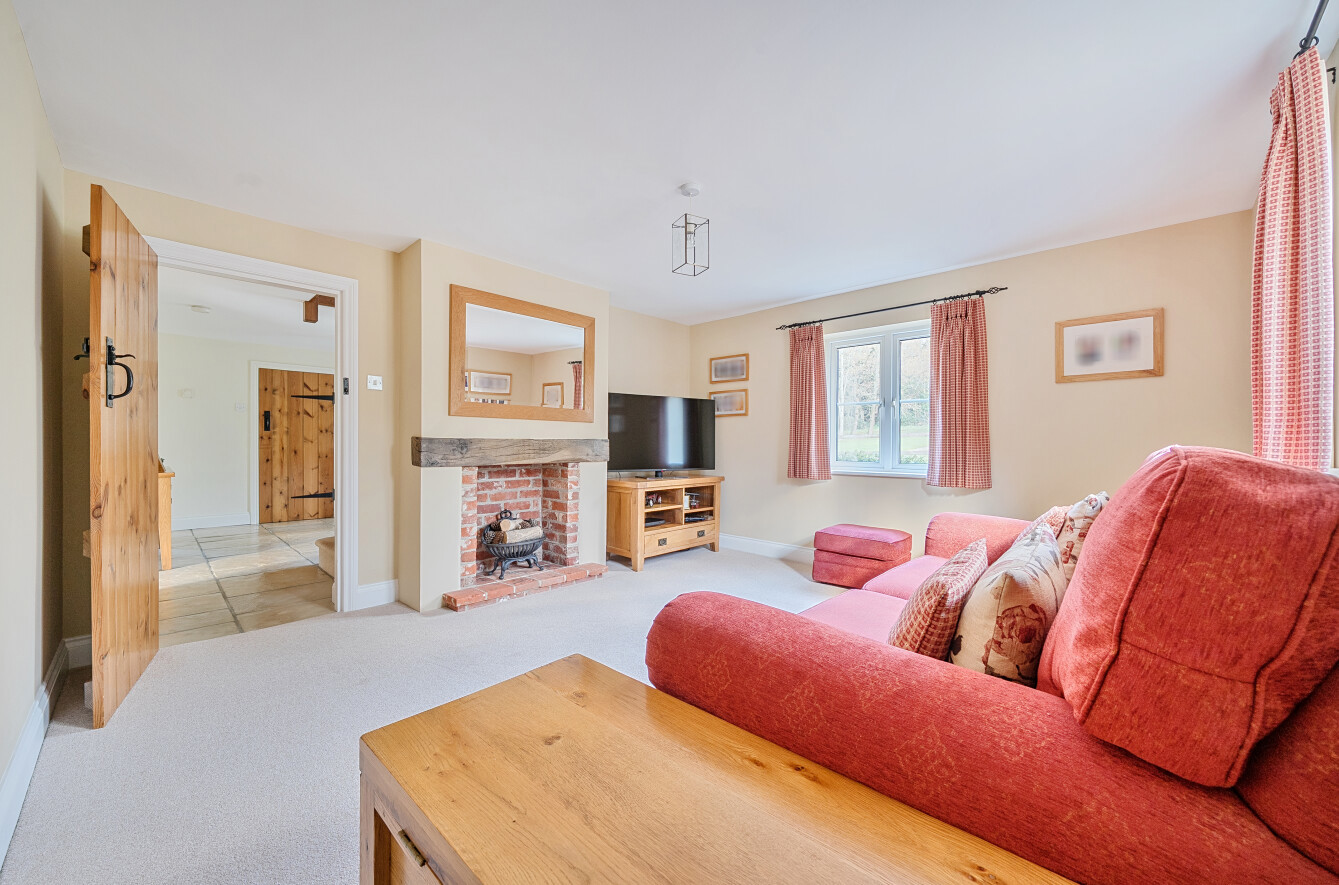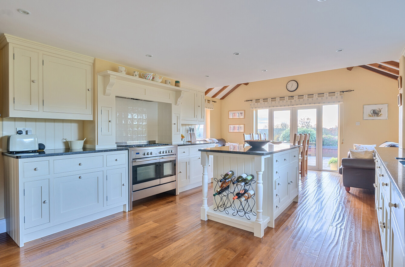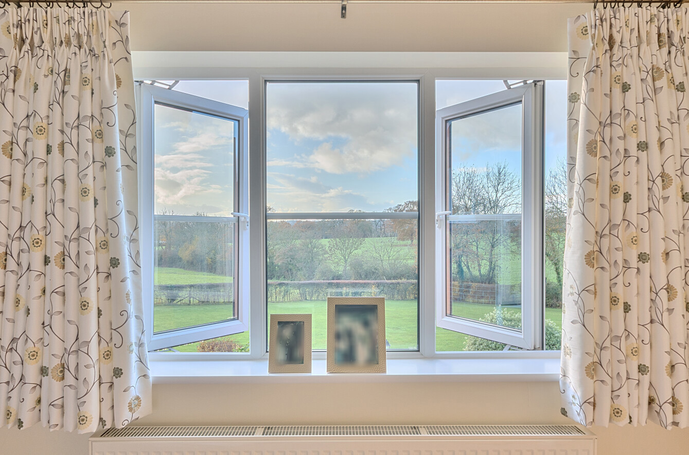 Inside, the current owners have carried out a meticulous renovation, retaining architectural character while updating the spaces to a high standard. The main hallway provides a warm welcome and flows naturally into the ground-floor accommodation. The handmade kitchen, complete with a separate utility area, leads into a dining area capped by a vaulted ceiling to the rear, from there, doors open onto a generous rear patio. This patio acts as a sun trap and enjoys views over the surrounding land, making it ideal for alfresco meals or entertaining. The dining area delivers sweeping 180-degree vistas across the property’s own land and neighbouring farmland, while the living room, with its open fireplace and west-facing aspect, provides a cosy yet expansive space to unwind.