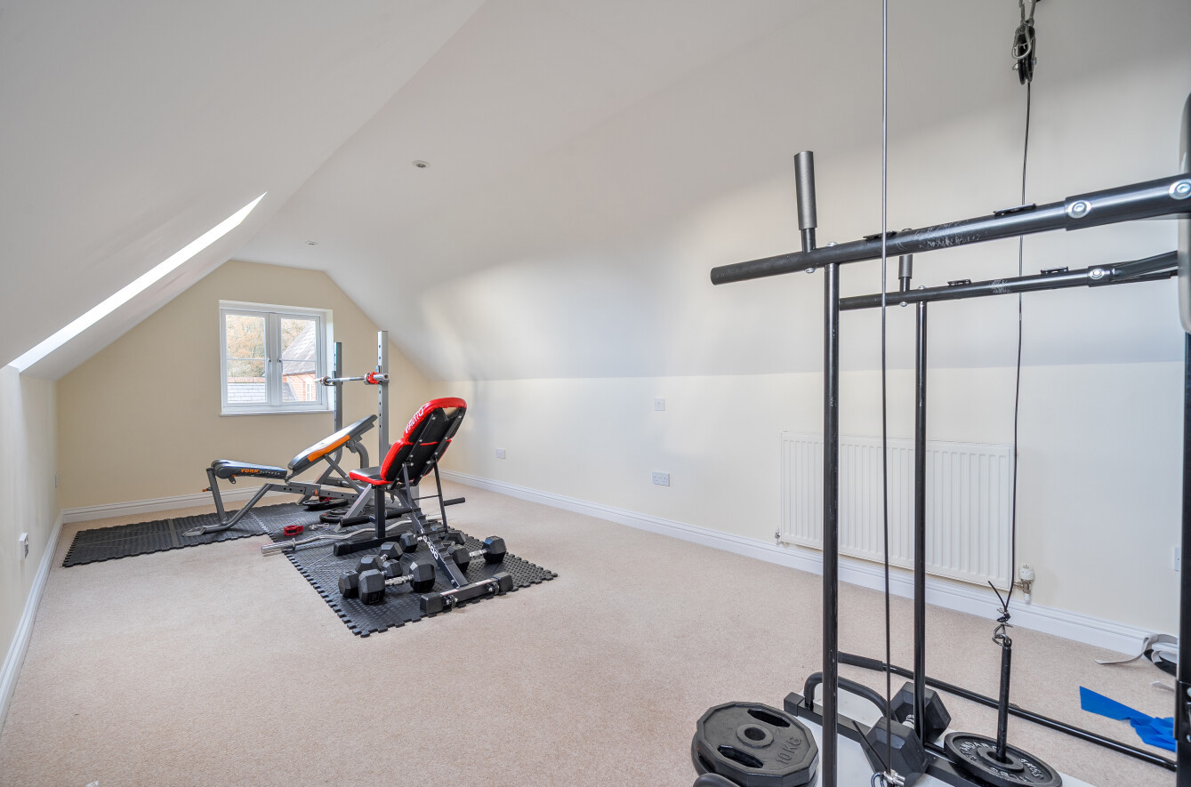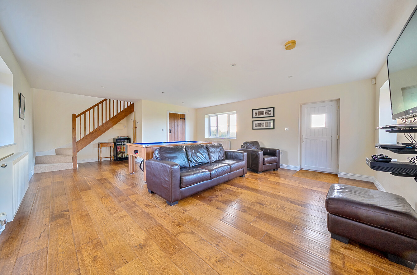 Outside, the property benefits from substantial outbuildings. Adjacent to the house is a large building providing a double garage with a boarded loft, a heated and powered workshop, and a generous games room, with plumbing already in place should you choose to add a shower room. Above this lies further space currently used as a gym, which could easily be repurposed. A separate brick and timber-built barn offers additional storage. The secure, well-maintained garden catches sunlight from sunrise to sunset.