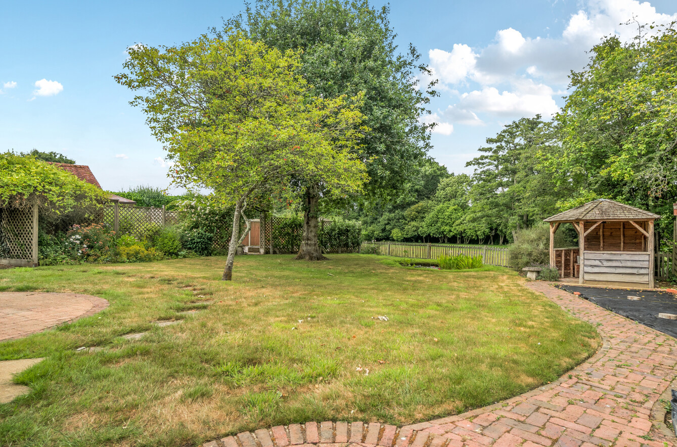 The gardens are a key feature, with the house centrally positioned within the plot, a large lawn, and a productive growing area. The property also benefits from ample parking and a detached garage.