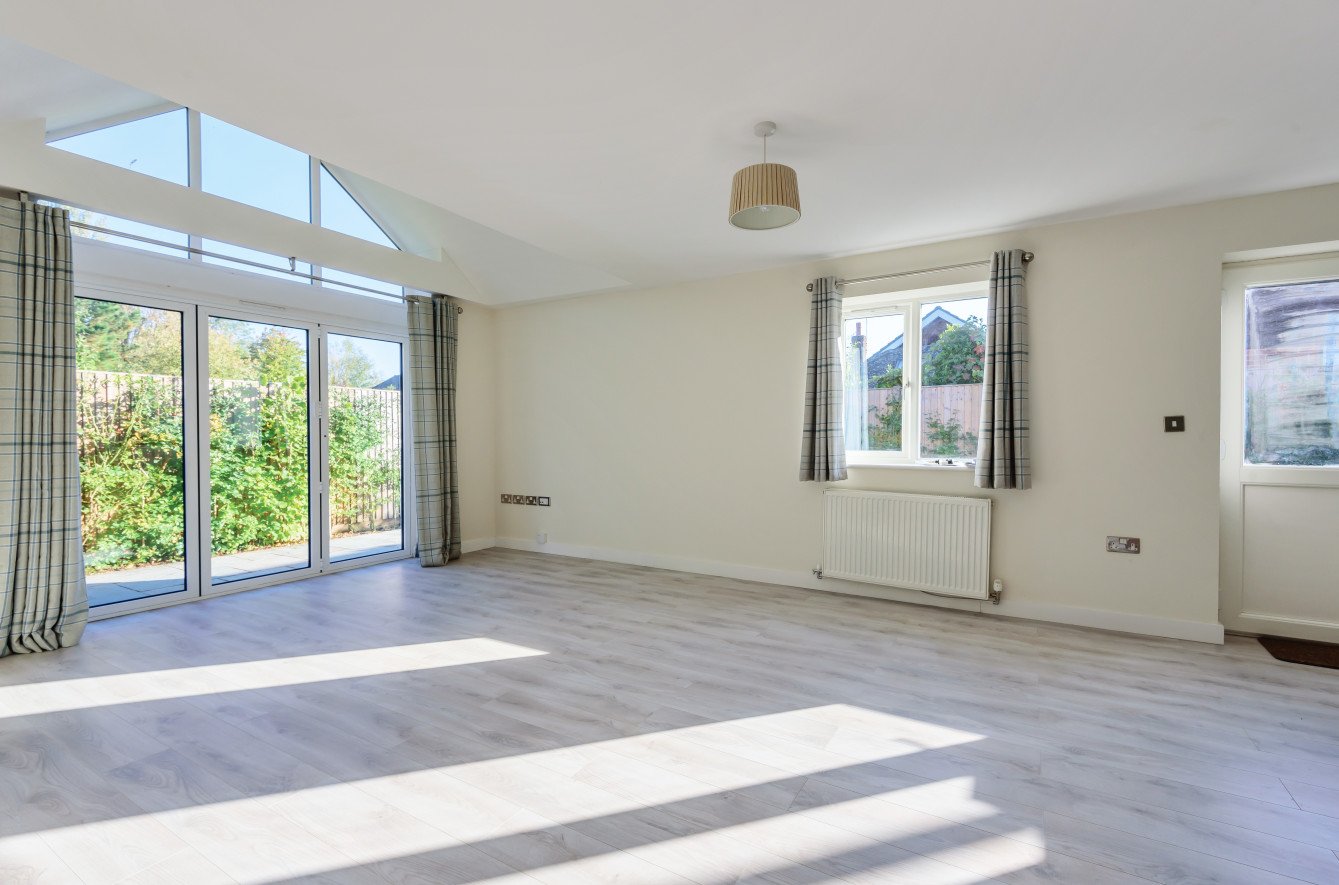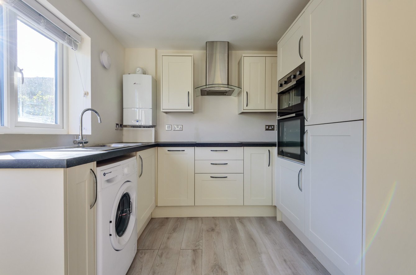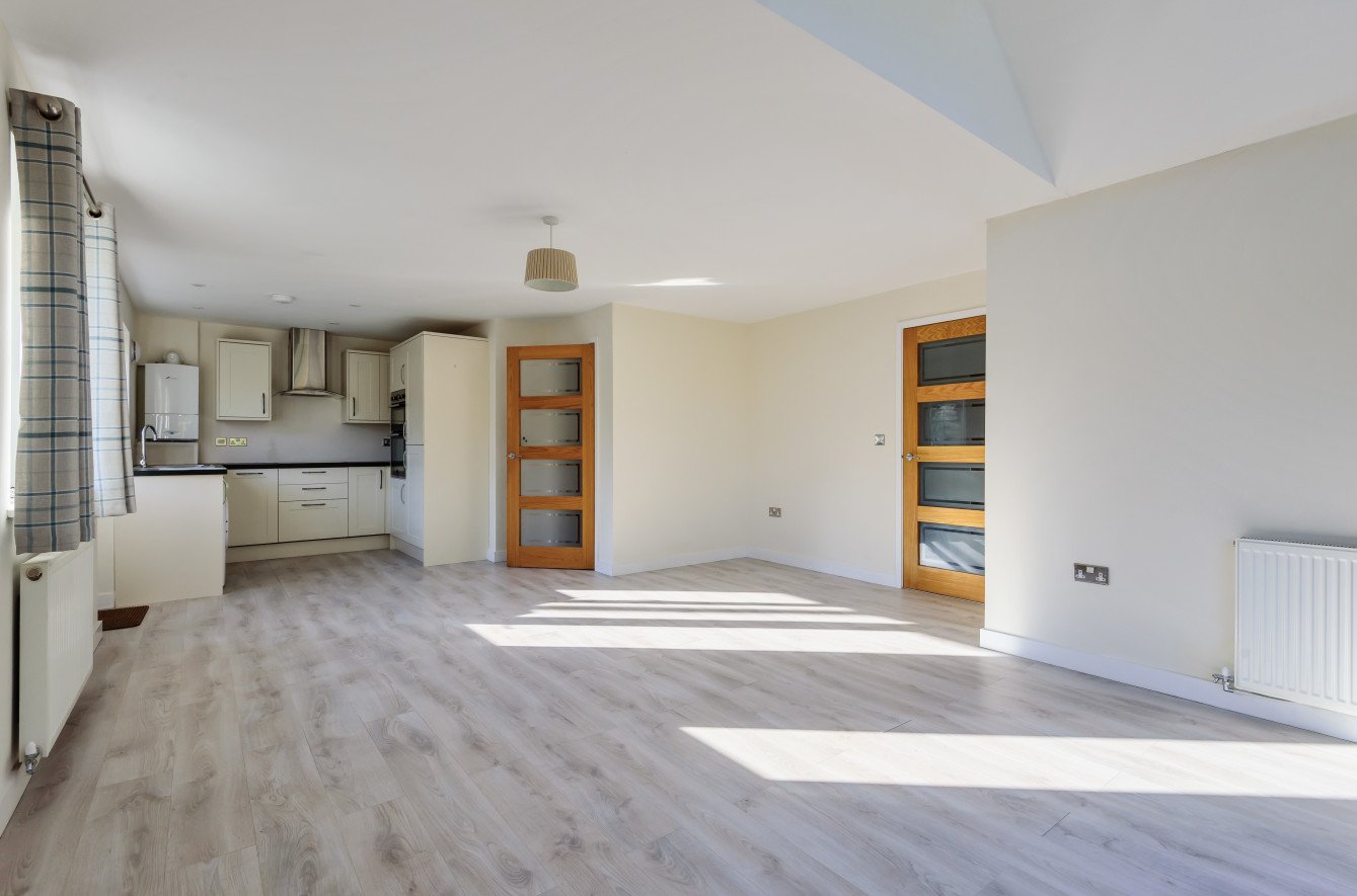 The generously proportioned kitchen/sitting room creates an ideal social hub, enjoying a dual aspect and direct access to the garden, perfect for entertaining or relaxing. A second double bedroom is served by a well-appointed family bathroom with a thermostatic shower over the bath.
