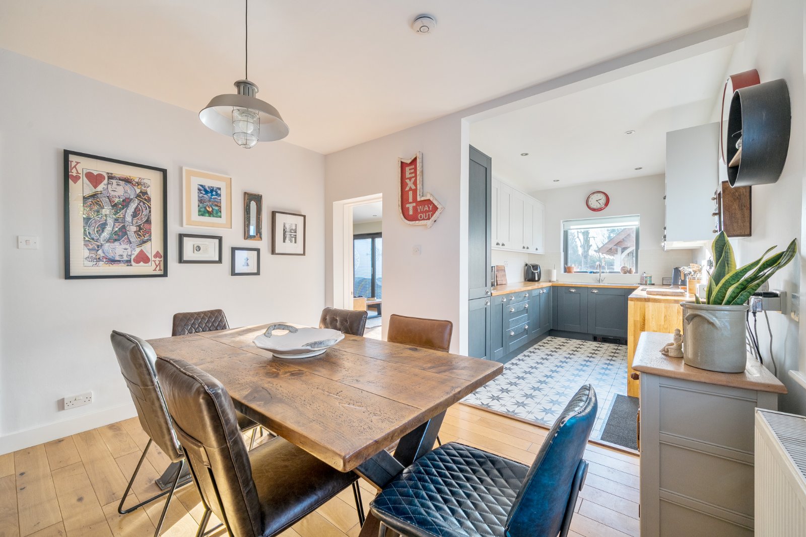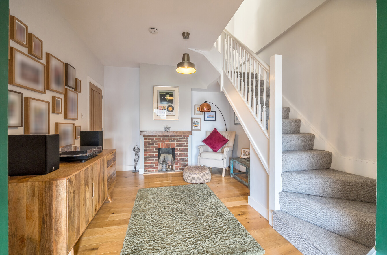 These open into a large sitting room that flows seamlessly into a light-filled home office complete with a feature fireplace. The contemporary kitchen offers an excellent range of wall and base units and leads through to a separate dining room. Two additional bedrooms and a family bathroom complete the ground floor layout.