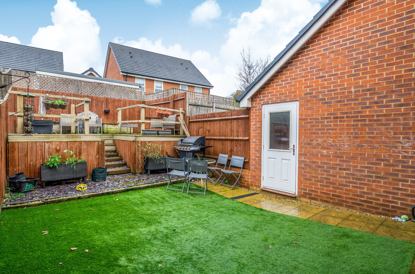 Externally, the property boasts a beautifully maintained rear garden, predominantly laid to artificial lawn with a raised deck ideal for outdoor dining and entertaining. Further benefits include a garage and driveway parking for two vehicles, offering excellent practicality.