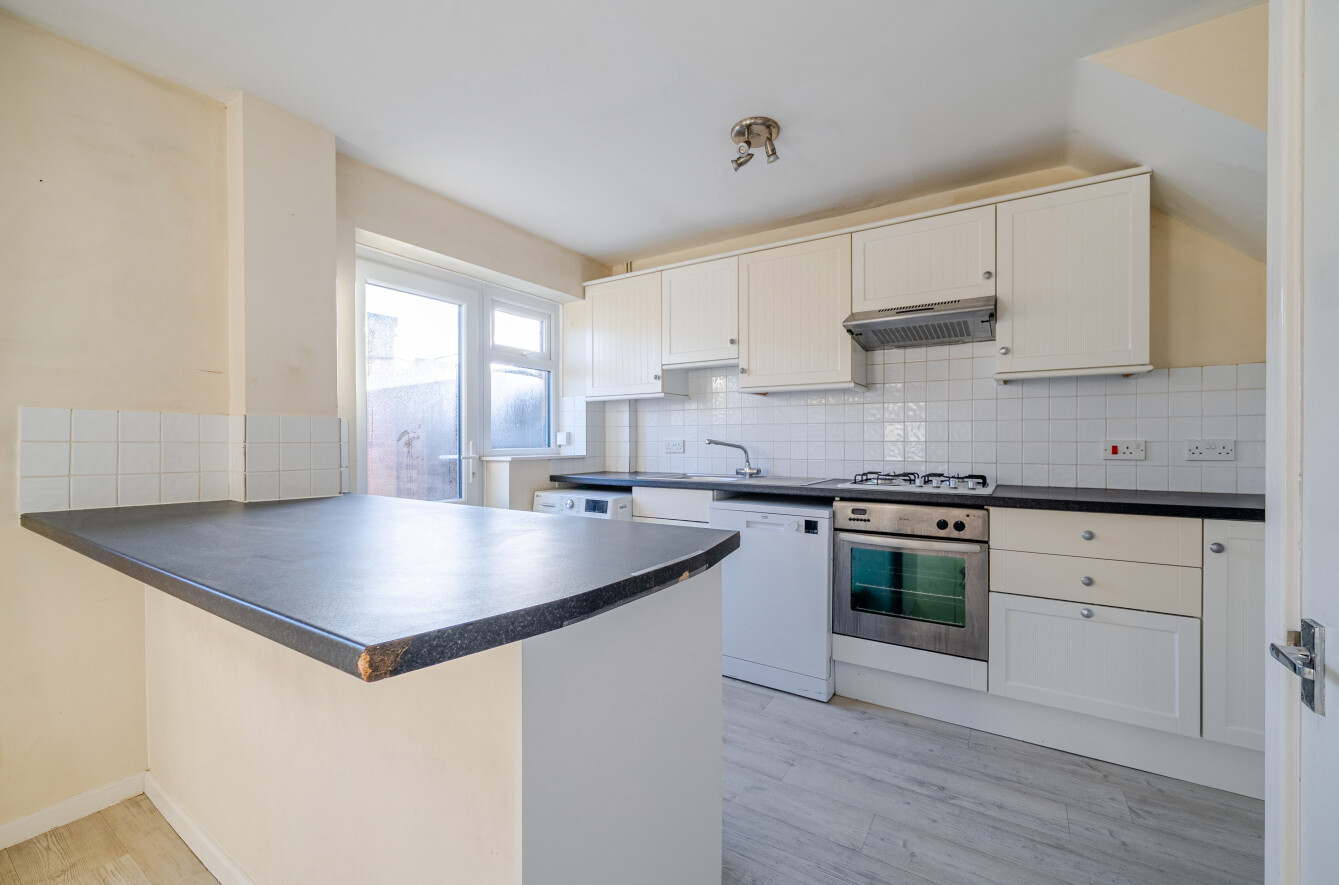An open-plan kitchen/dining room overlooks the rear garden and offers space for white goods, along with ample base and wall-mounted storage.