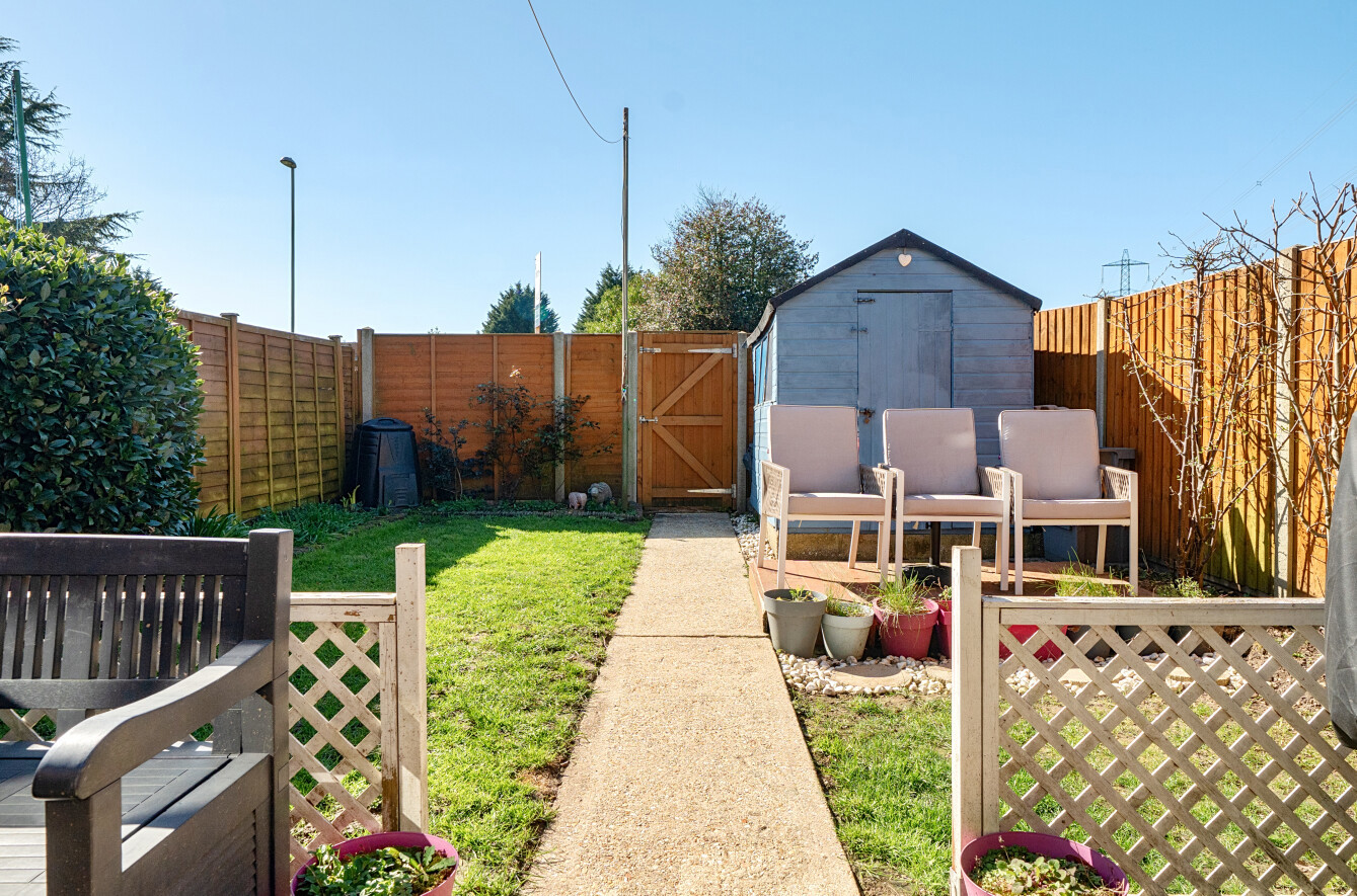 Double doors lead seamlessly out to a south-west facing rear garden, where you can enjoy open views across fields. The garden itself benefits from a patio area—perfect for outdoor dining—and a practical shed for storage.