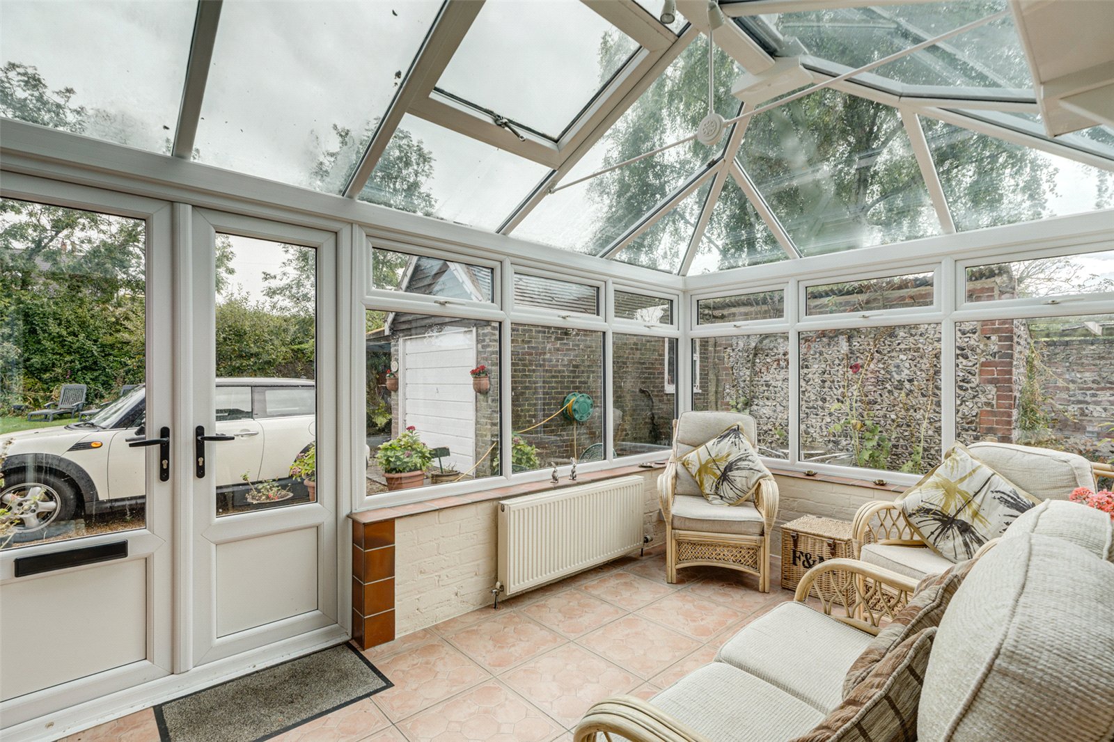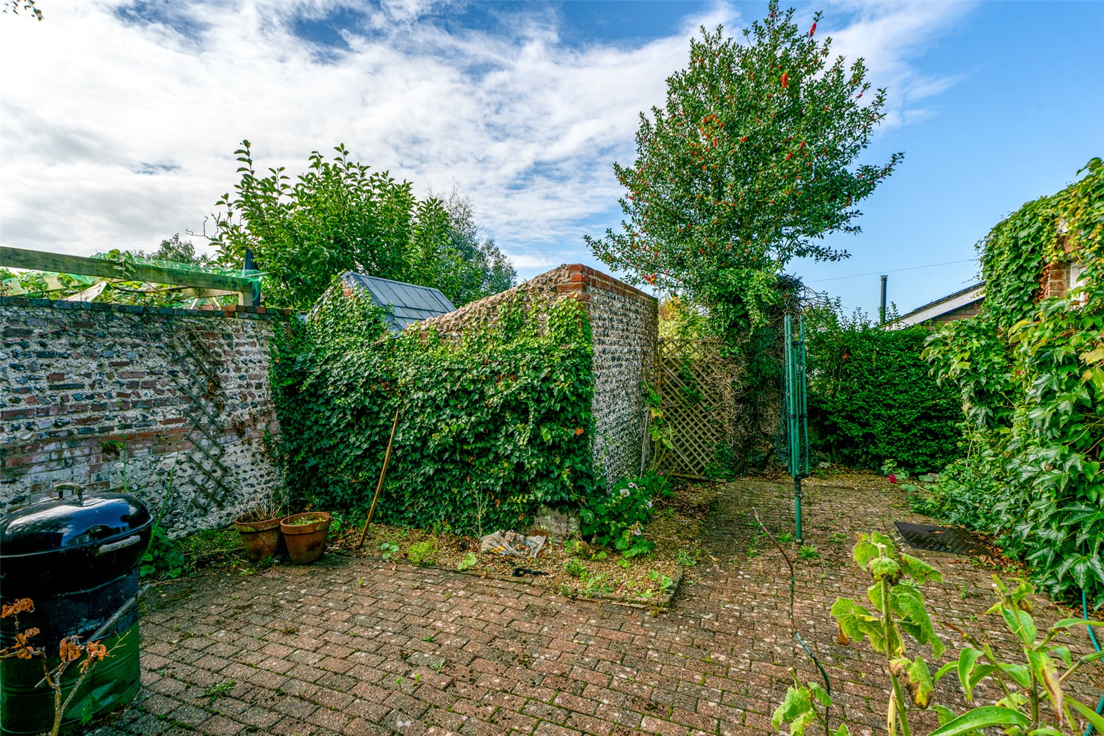 Outside, the property enjoys a generous plot enclosed by traditional flint walls and mature hedging. The main garden, laid to lawn and dotted with established shrubs and trees, provides a wonderful sense of privacy and tranquillity. Across a gravel driveway, a second garden area offers a low-maintenance block-paved terrace, perfectly suited to outdoor seating and alfresco dining. An outbuilding with space for kitchen whitegoods, garage, carport, and multiple parking spaces accessed via a wooden gate further enhance the property’s practicality.