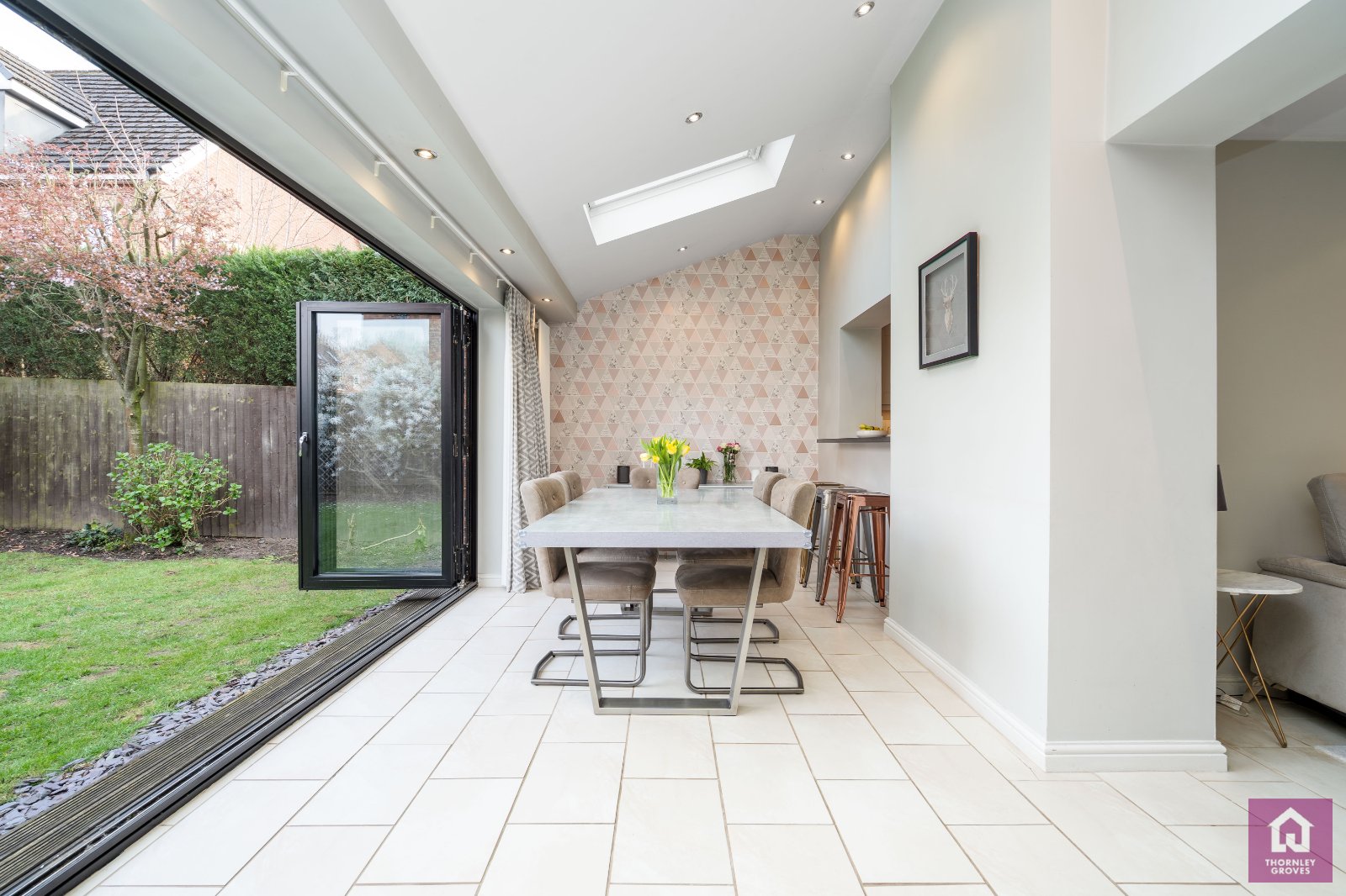 The accommodation is thoughtfully arranged and ideally suited to modern family living. On entering the property, you are welcomed by a bright and inviting hallway. To the ground floor, there is a peaceful morning room, perfect for relaxing or working from home, alongside a spacious kitchen and a generous open-plan living and dining area. This superb space is filled with natural light and features bi-fold doors opening onto a private, non-overlooked garden, providing an ideal setting for both entertaining and everyday family life. A convenient ground floor W/C and access to the attached garage complete this level.