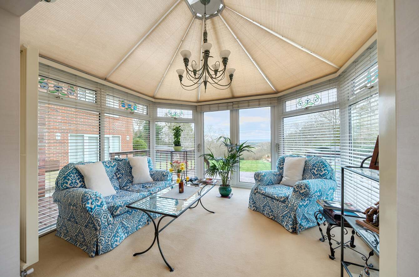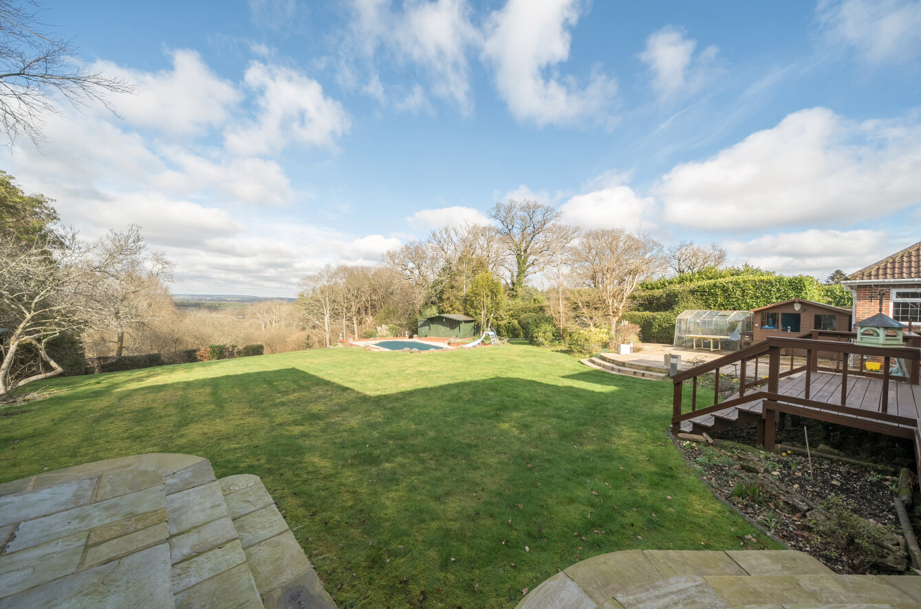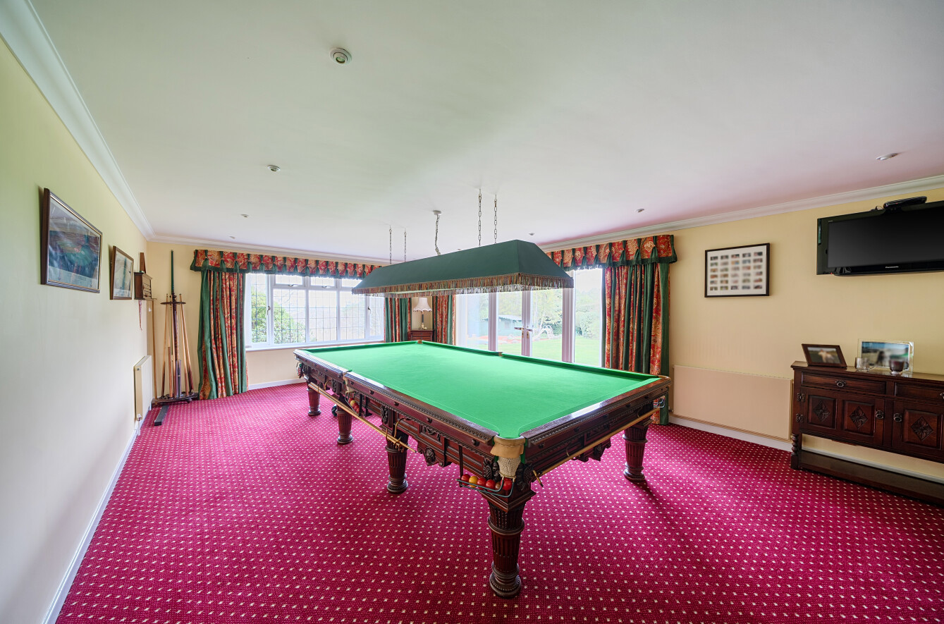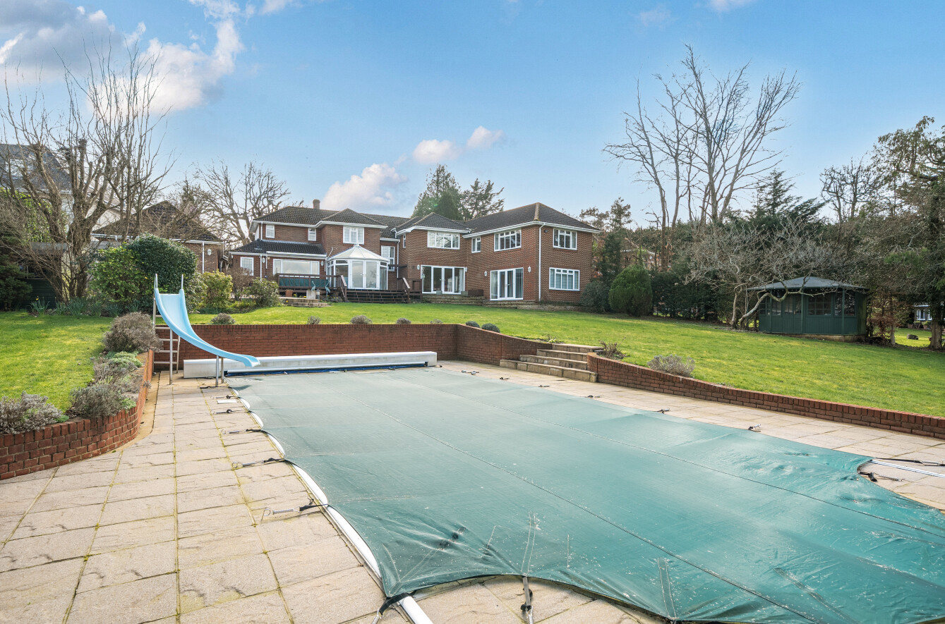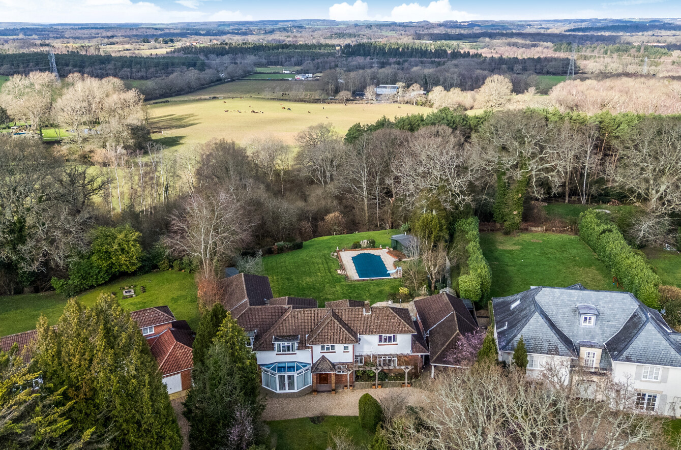 Outside, wooden automated gates that have an intercom opening to the shingle driveway that in turn leads to the oak framed carport and double garage that has a wine cellar and a useful loft room above. The front garden has an array of spring flowering shrubs and the pergola is adorned with a mature wisteria. The delightful rear garden boasts an extensive deck and a large paved patio. The heated swimming pool is set in a paved terrace with an electric cover, an adjacent equipment shed and a changing room that has a sauna cabin. There is a workshop, greenhouse, a further shed and a sit on mower store together with a cedar summerhouse found on the left boundary. The garden is predominantly laid to lawn and backs onto a small wooded area of farmland.