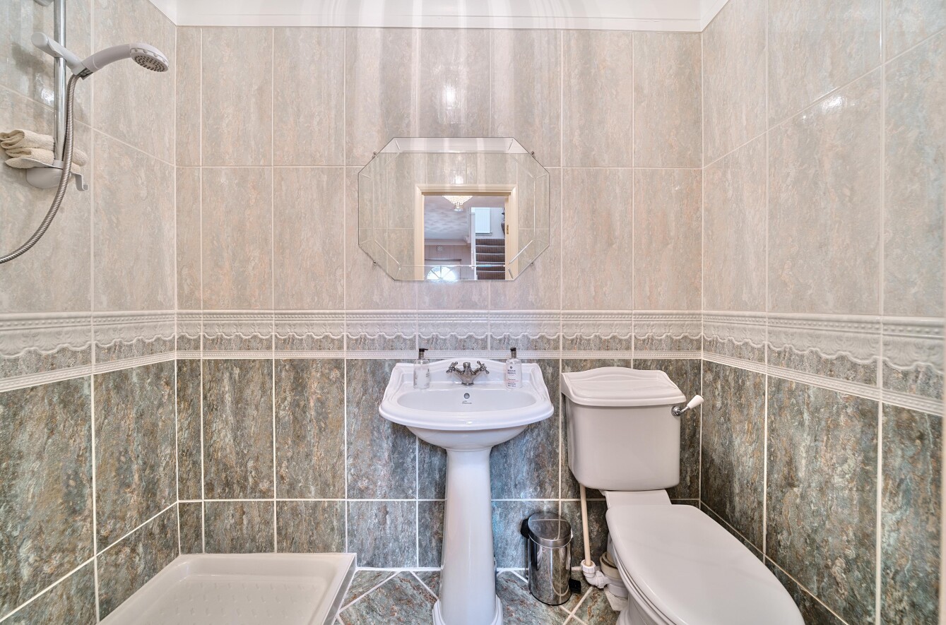 The generous landing allows access to five double bedrooms that are served by three en-suites and a well-appointed, fully tiled family bathroom with the main bedroom also benefitting from a pine sauna.