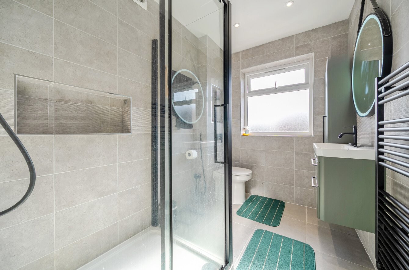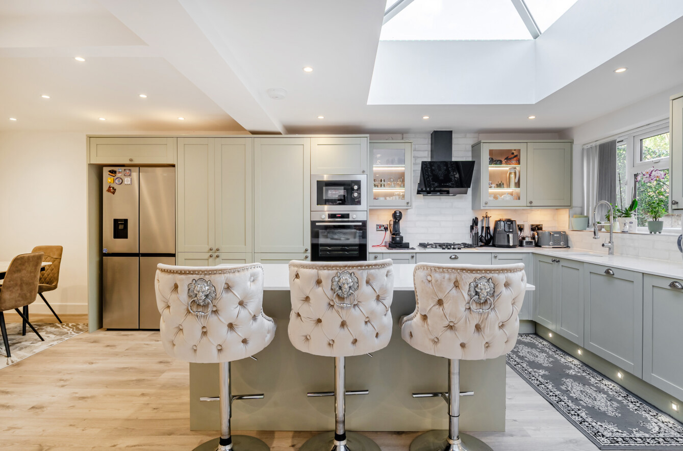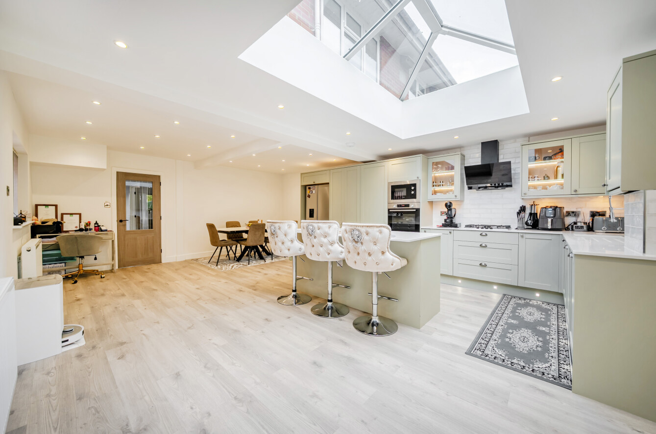 There is a roof lantern with background lighting and doors overlooking the garden. On the first floor there are three well proportioned bedrooms served by a stylish modern shower room. The block paviour driveway allows off road parking for several vehicles and the rear garden has a leafy outlook.