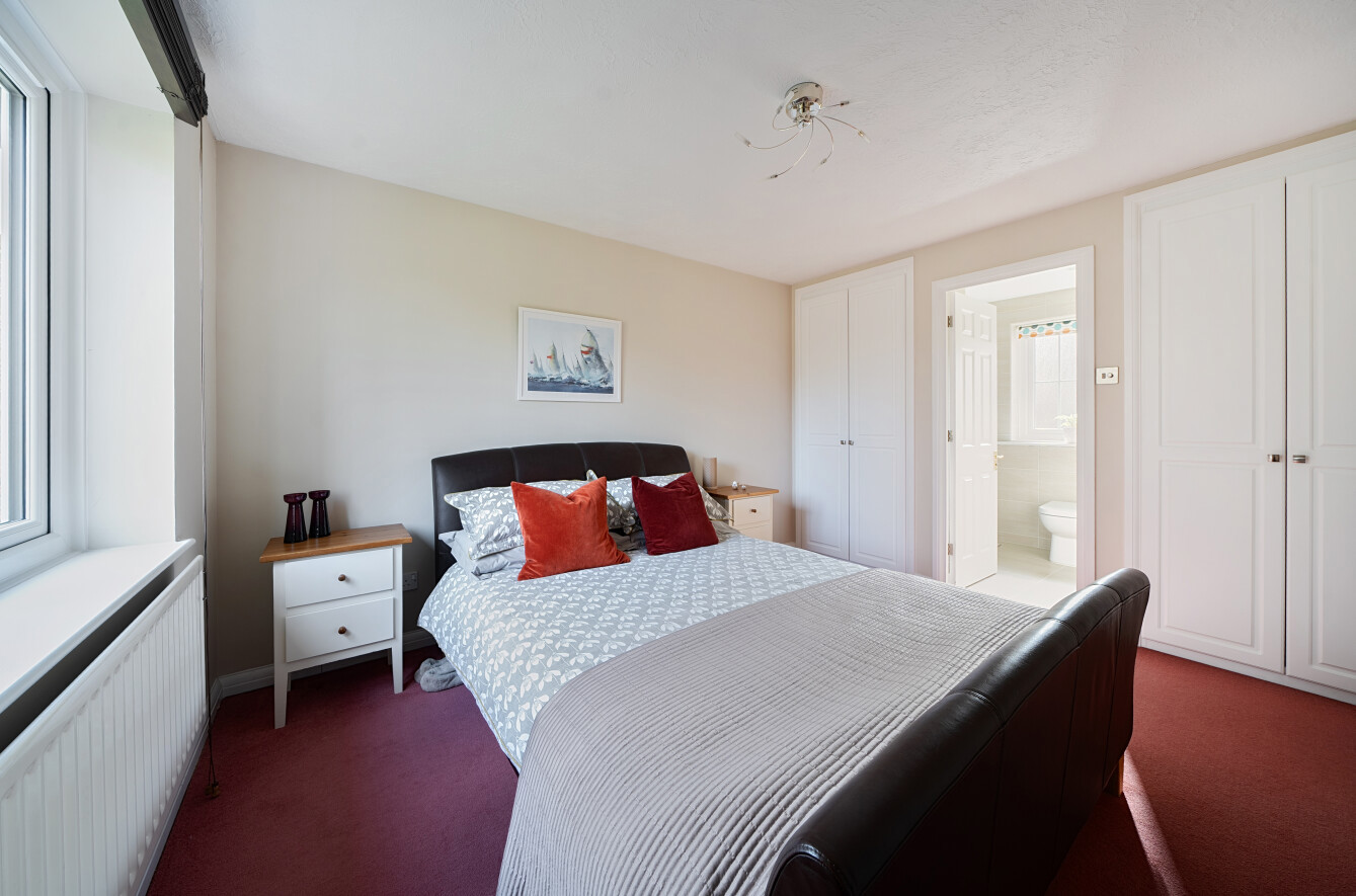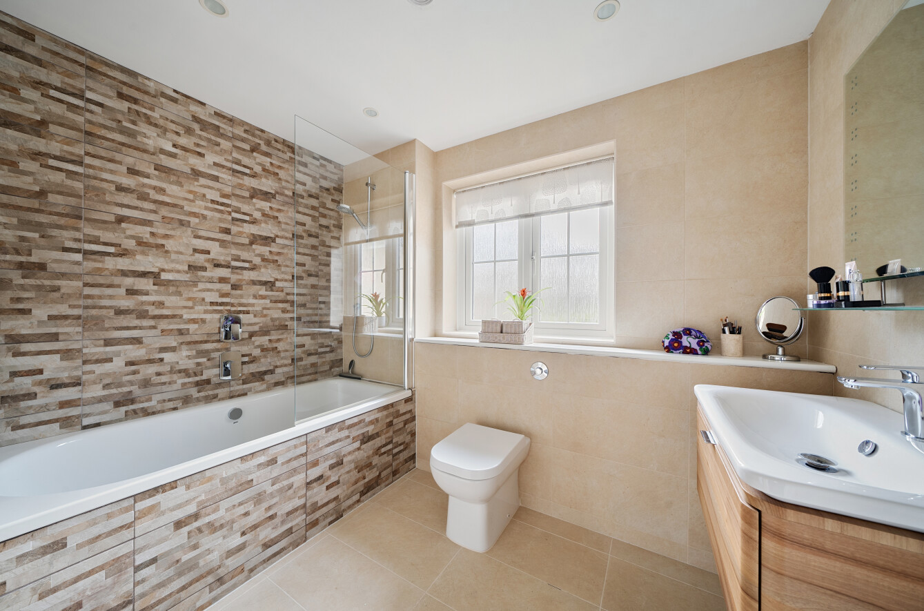 Upstairs, a generous landing leads to five well-proportioned bedrooms, offering flexible accommodation for growing families. The principal suite enjoys a peaceful rear aspect overlooking the garden and benefits from an excellent range of built-in wardrobes. It is complemented by a stylish en-suite shower room, fitted with a sleek three-piece suite comprising a walk-in shower, WC and wash hand basin. The second bedroom also features built-in wardrobes and the added convenience of its own en-suite shower room. The remaining bedrooms are served by a well-appointed family bathroom, fitted with a three-piece suite including a panelled bath with shower over, wash hand basin and WC, complemented by neutral tiling.