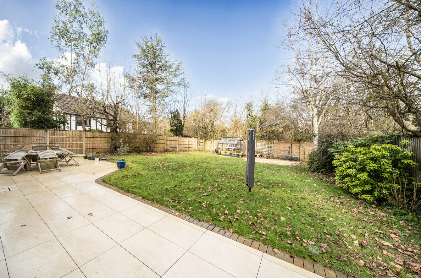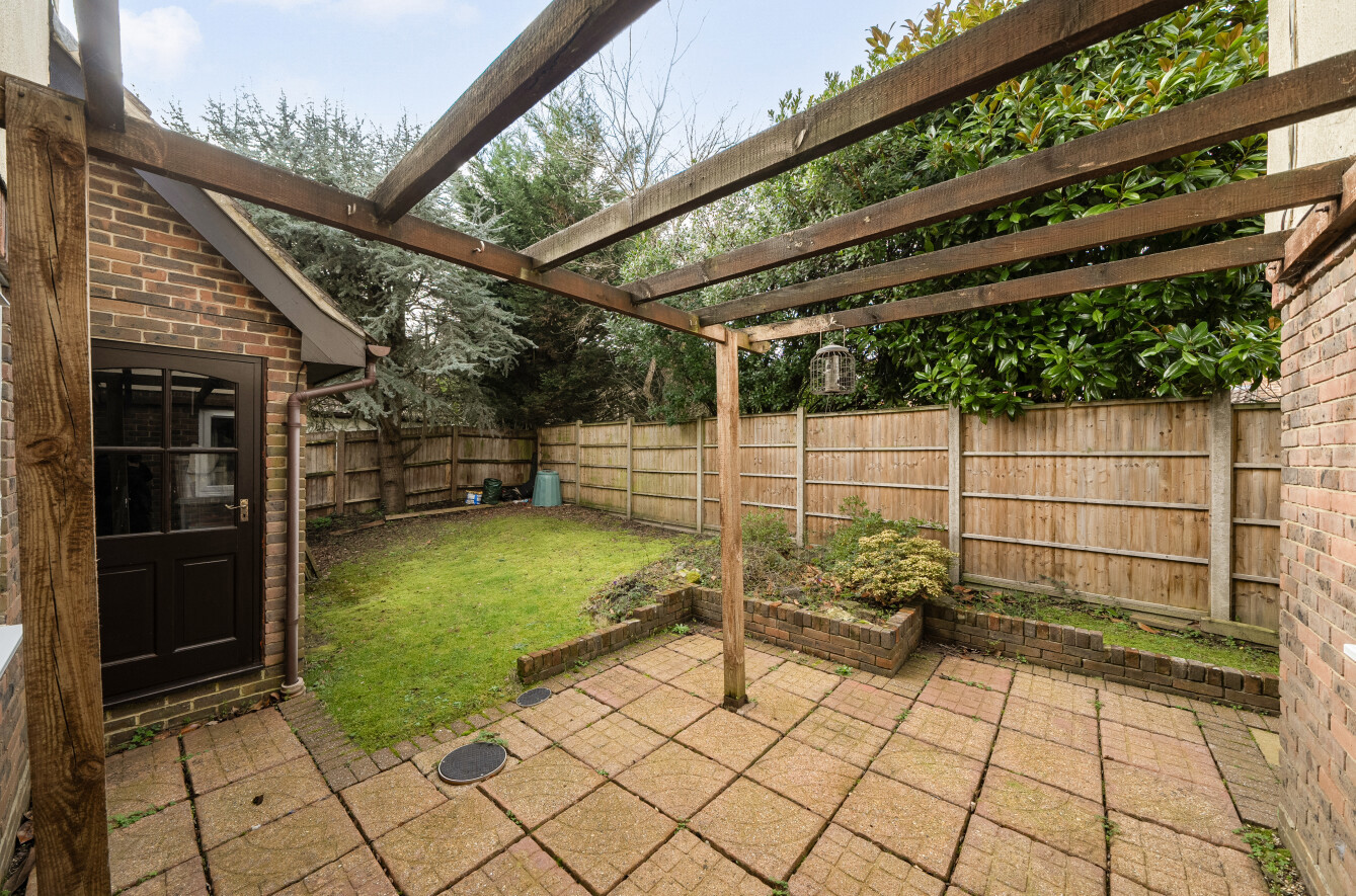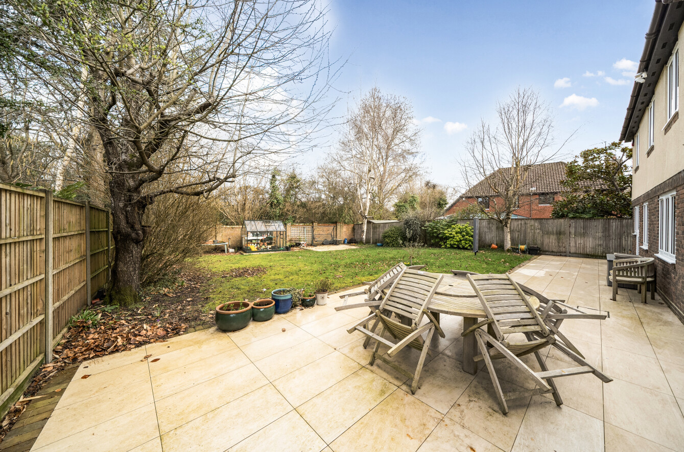 The beautifully maintained rear garden enjoys a sunny aspect and offers a high degree of privacy. Predominantly laid to lawn, it is complemented by a generous patio area, perfect for al fresco dining and outdoor entertaining. Mature shrubs and established trees create a peaceful and secluded setting, while an additional seating area, known as the ‘Side Garden’, provides an ideal spot to enjoy the afternoon and evening sun.