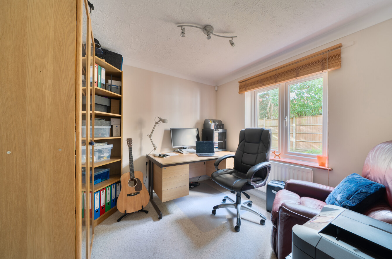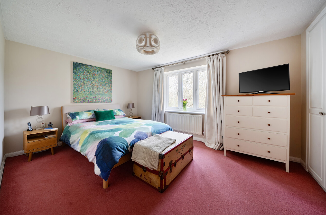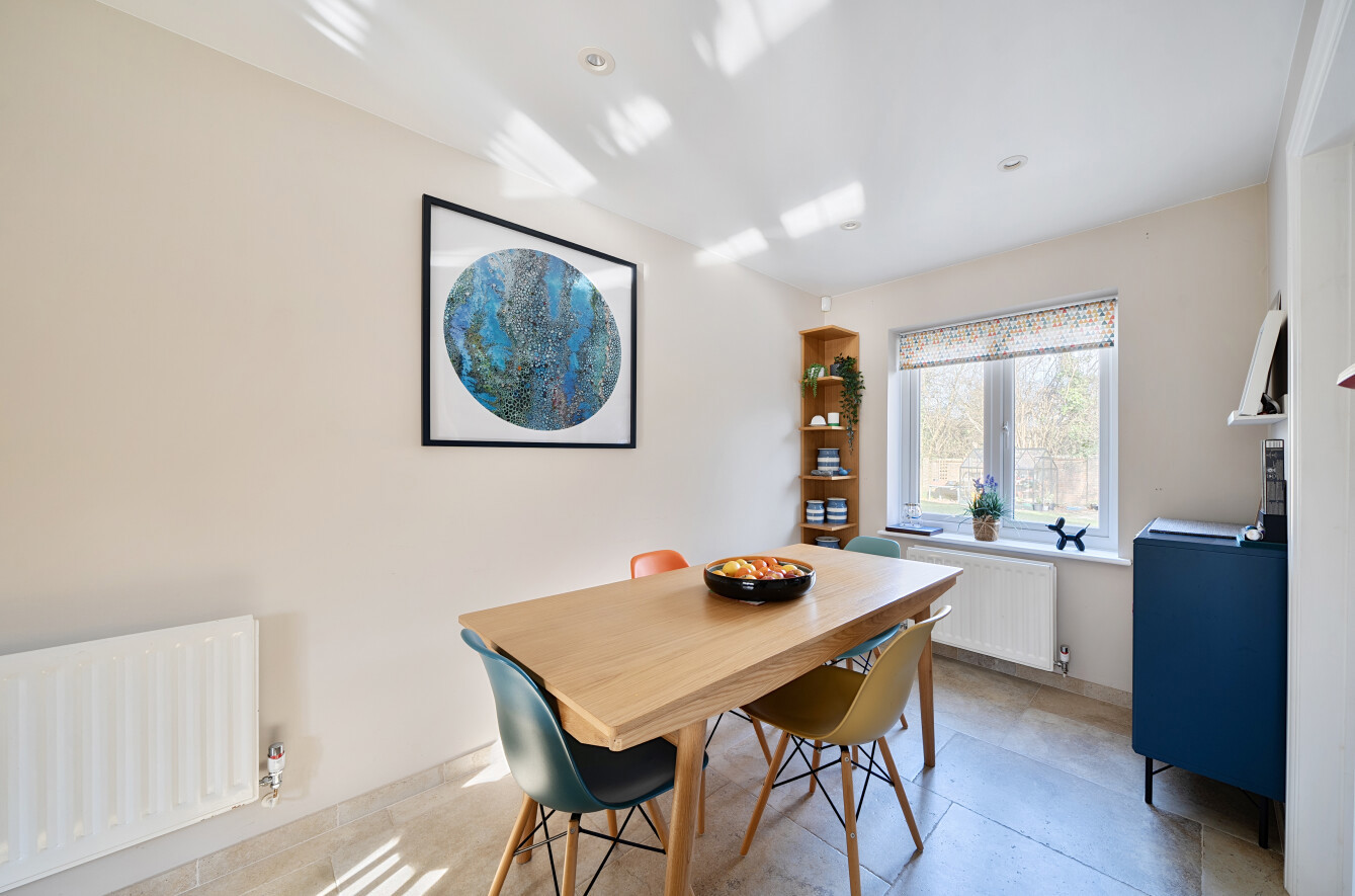 The beautifully maintained rear garden enjoys a sunny aspect and offers a high degree of privacy. Predominantly laid to lawn, it is complemented by a generous patio area, perfect for al fresco dining and outdoor entertaining. Mature shrubs and established trees create a peaceful and secluded setting, while an additional seating area, known as the ‘Side Garden’, provides an ideal spot to enjoy the afternoon and evening sun.