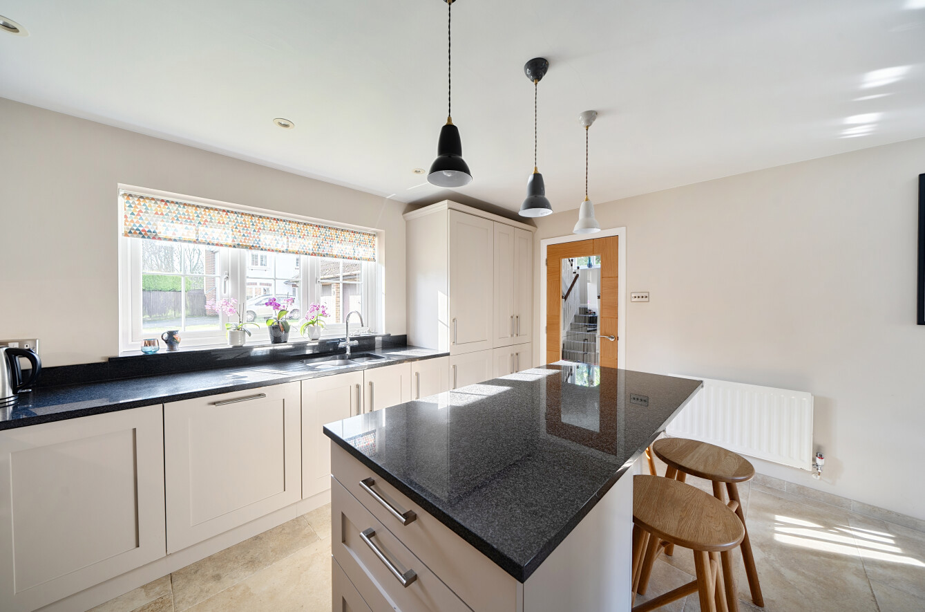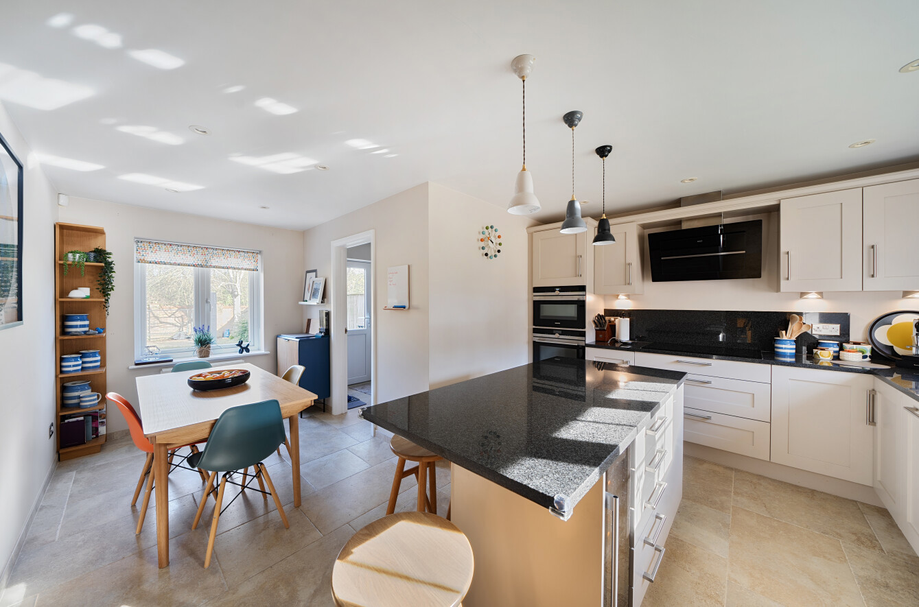 On entering the property, you are welcomed by a spacious entrance hallway that immediately sets the tone for the well-presented interiors beyond. The generous living room provides a peaceful and inviting retreat, perfect for cosy evenings. Dual-aspect windows and French doors allow natural light to flood the space, enhancing its warm and welcoming ambience. A separate study offers an ideal environment for those working remotely, while an additional reception room, currently arranged as a formal dining room provides versatile accommodation to suit a range of needs, such as a playroom or family room. Double doors connect this room to the lounge, creating a wonderful flow for both everyday living and entertaining. The beautifully appointed kitchen and breakfast room serves as the heart of the home. Featuring a central island with breakfast bar, it creates a sociable setting ideal for family life and hosting guests. An extensive range of stylish wall and base units are complemented by granite worktops and a built-in pantry cupboard, ensuring ample storage and preparation space. A well-equipped utility room with rear access to the garden, together with a contemporary cloakroom, completes the ground floor accommodation.