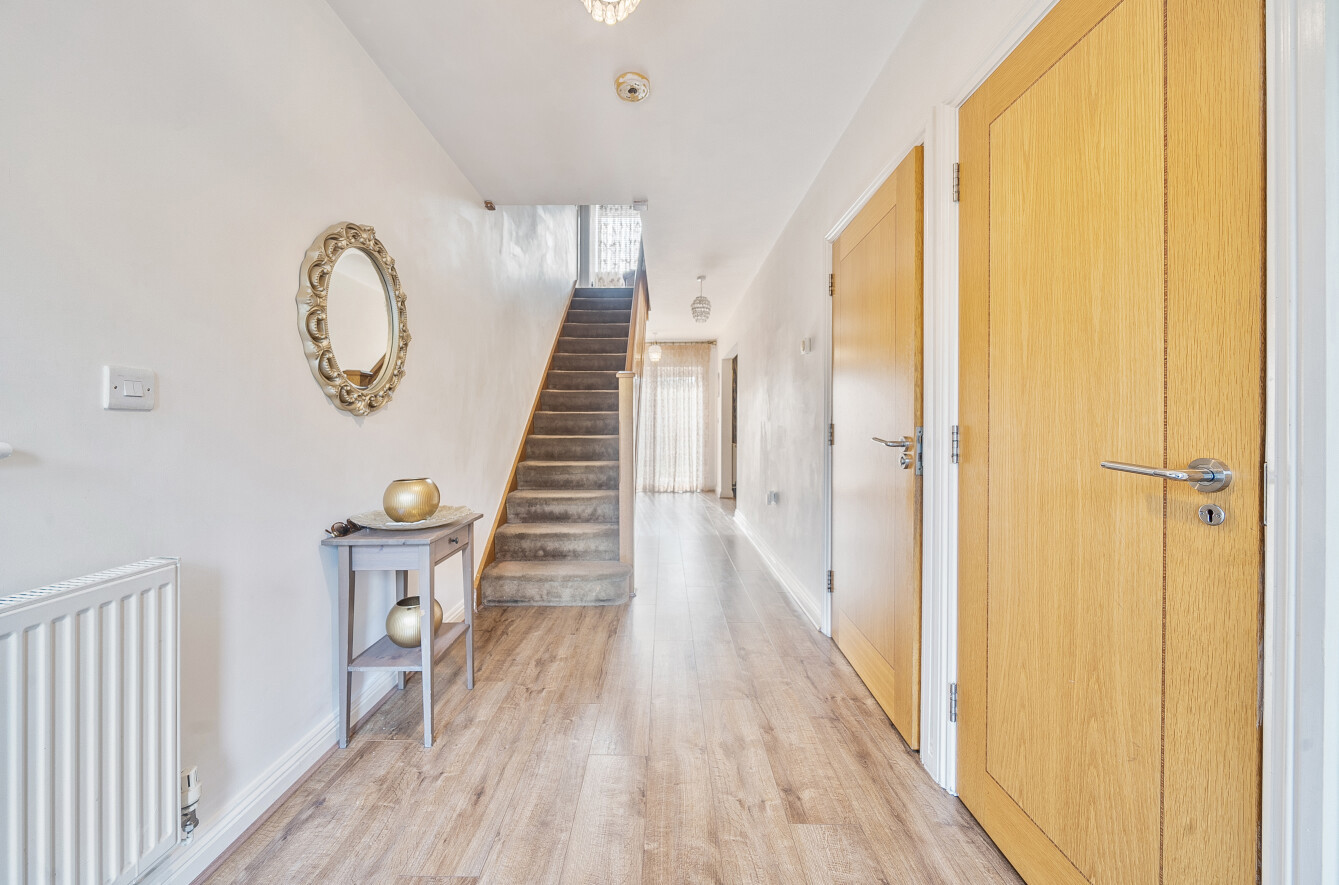 On the first floor the central landing has a linen cupboard and allows access to four well-proportioned bedrooms that all benefit from fitted wardrobes. The principal has an en-suite shower, the two bedrooms on the left have southerly facing doors with Juliet balconies and the bathroom displays a stylish, three piece white suite.