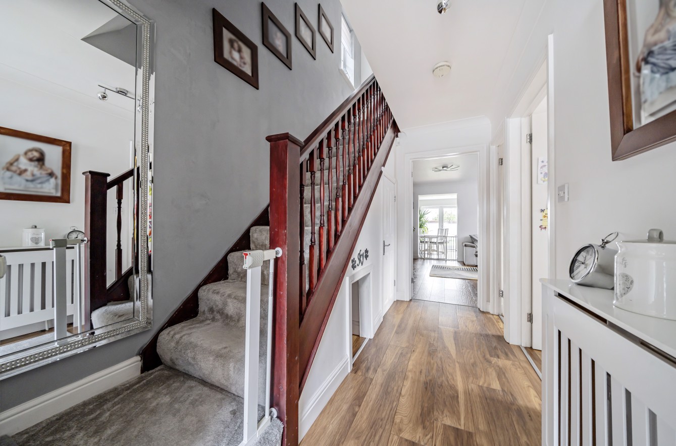 Upstairs, the first floor landing gives access to the loft and leads to three well-proportioned bedrooms. The principal bedroom enjoys a sleek en-suite shower room and built-in double wardrobes.