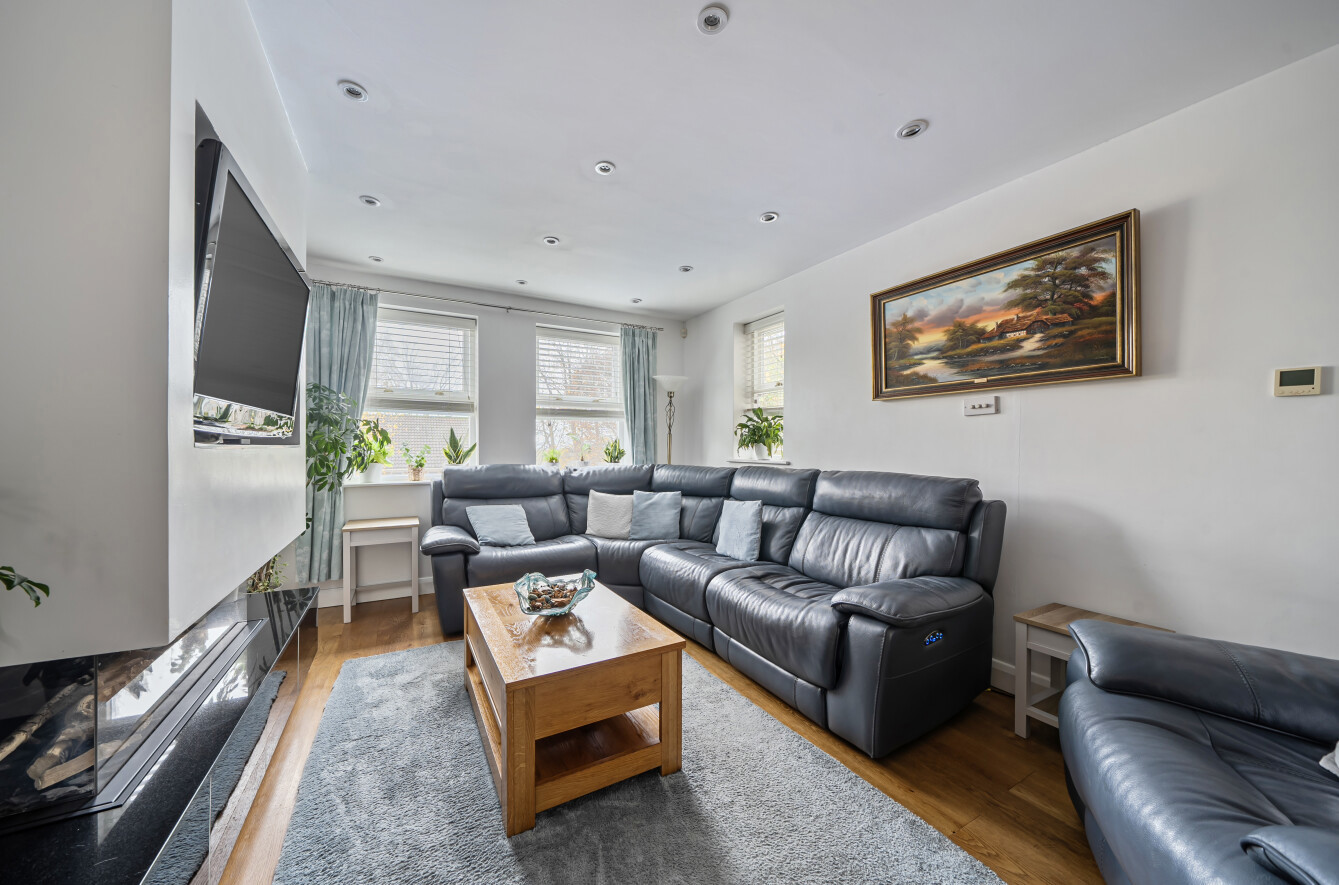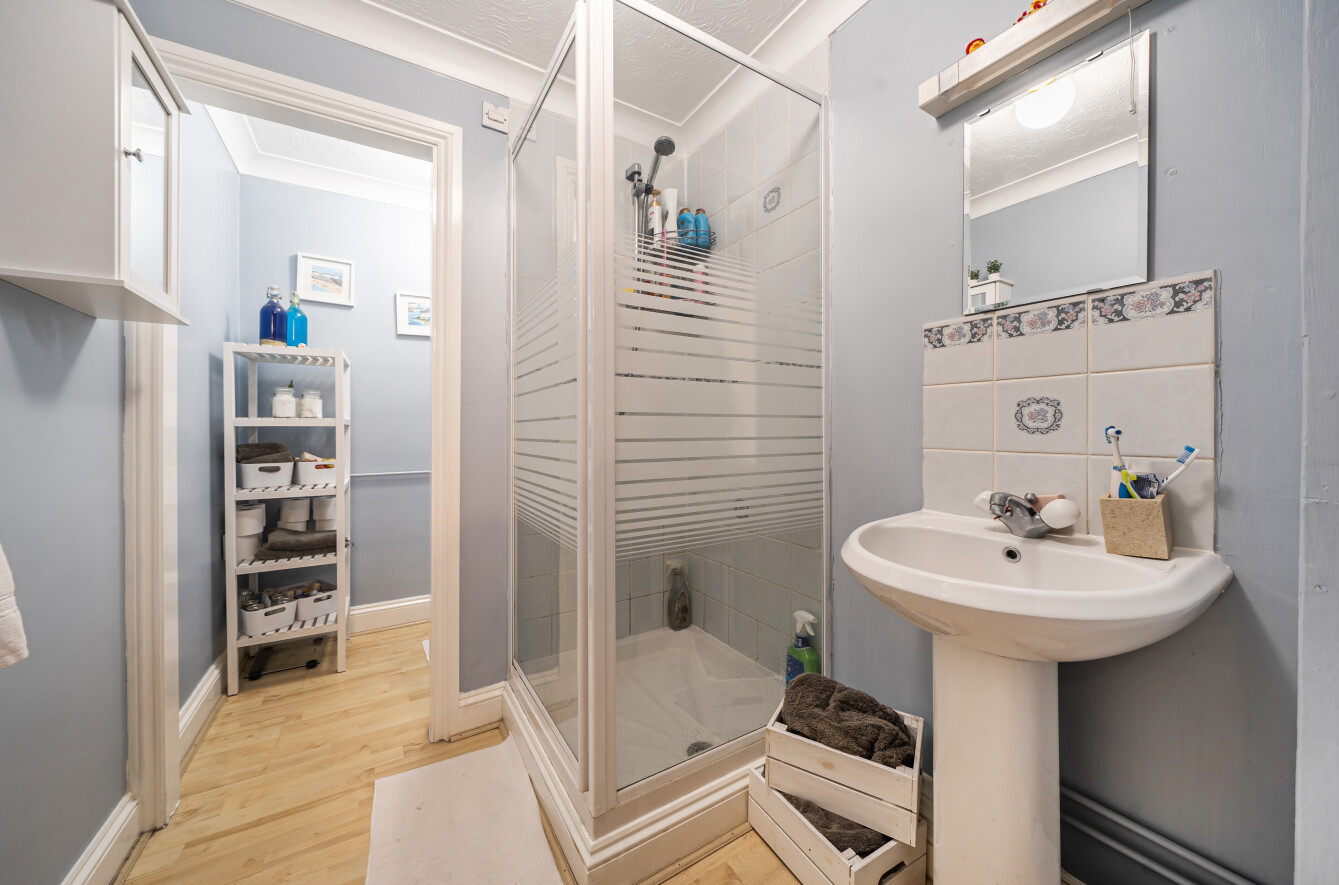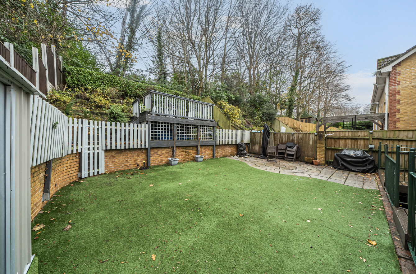 In addition to garden access from both the living room and kitchen, there is also gated side access leading to the generous rear garden. This low-maintenance space includes artificial lawn and a raised decked area, perfect for entertaining, all framed by mature shrub borders. The lower ground floor hosts a self-contained one-bedroom apartment—ideal for multigenerational living or as a potential rental opportunity. It features a double bedroom, modern fitted shower room, and a well-equipped kitchen with integrated appliances. The living room enjoys sliding doors that open onto a private courtyard garden, offering additional seclusion for the occupant.
