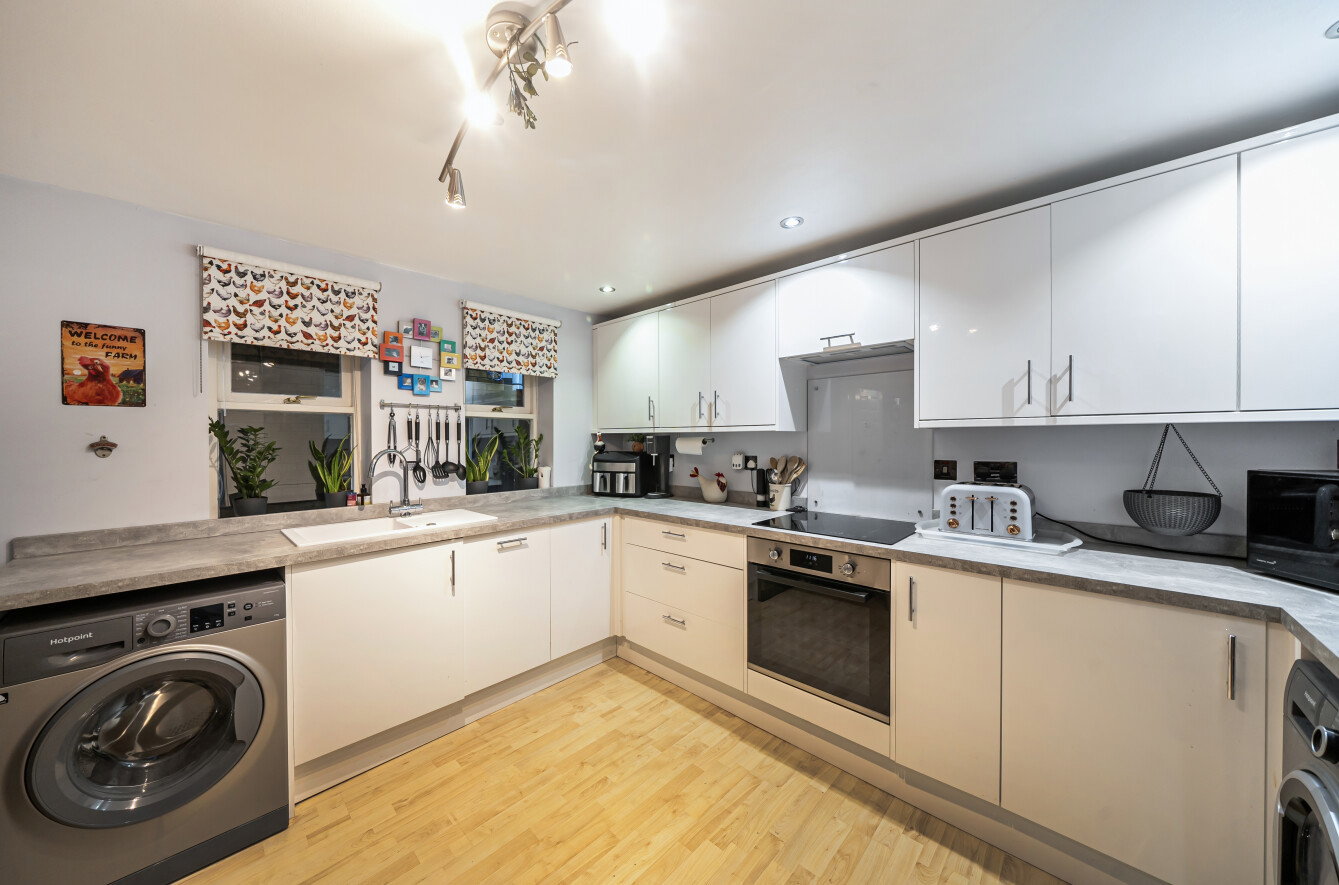At the back of this floor is a modern fitted kitchen, complete with a range of wall and base units, an integrated oven, hob and extractor, plus space for additional freestanding appliances. A door from the kitchen also provides access to the garden.