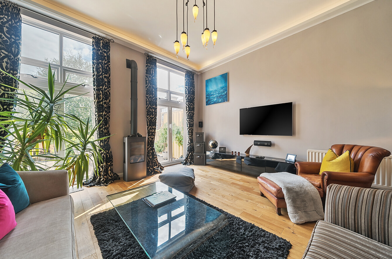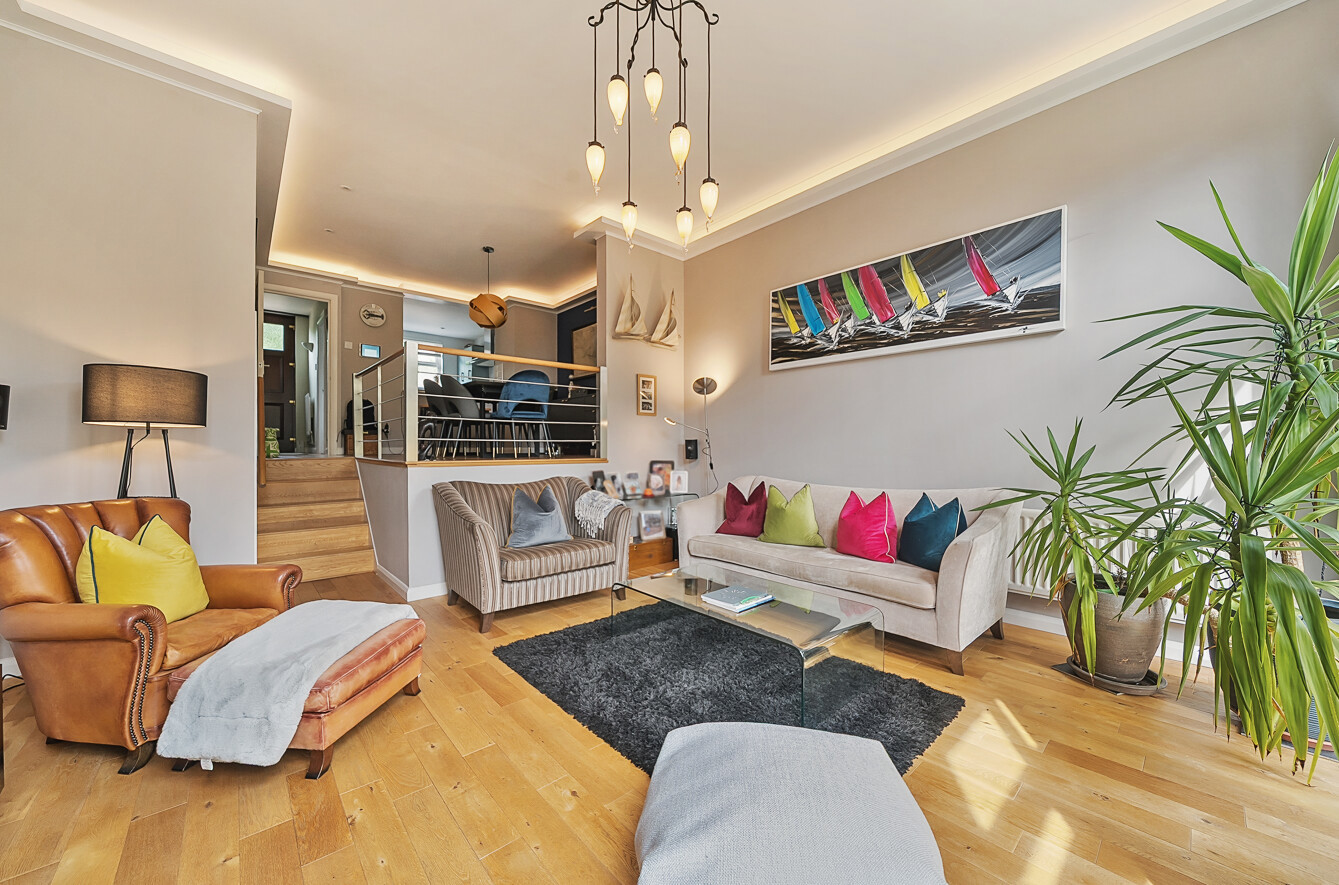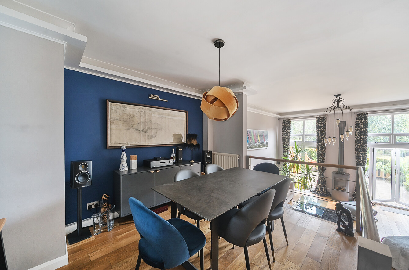 Upon entering, a generous hallway leads you to the main living level the heart of the home. A sleek, contemporary kitchen opens to an elevated dining area that overlooks a striking sitting room below. Just a few steps down, the living space impresses with its floor-to-ceiling windows and French doors, flooding the area with natural light and providing direct access to the south-facing rear garden.