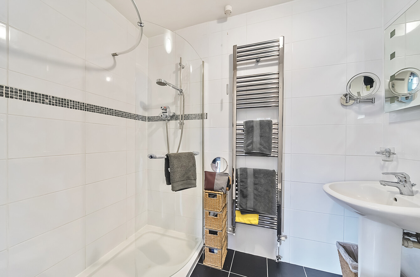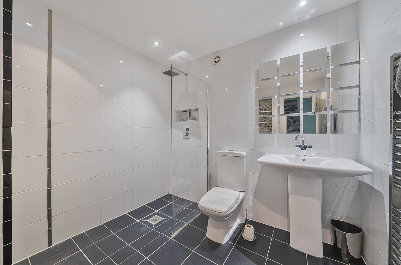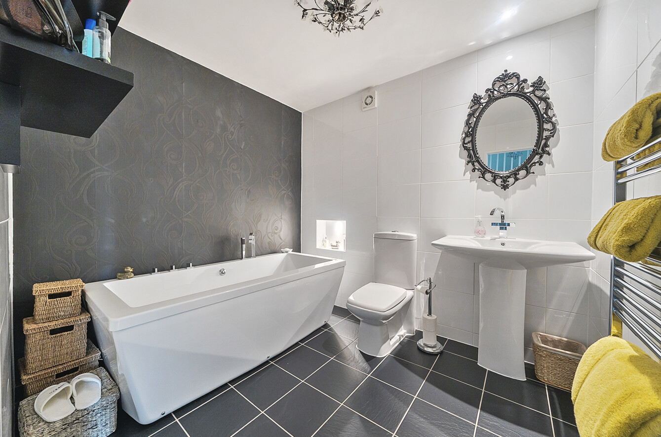 On the second floor, you’ll find two well-proportioned bedrooms, including the principal suite with built-in wardrobes and a stylish en-suite shower room. A spacious family bathroom with a white three-piece suite serves the second bedroom.