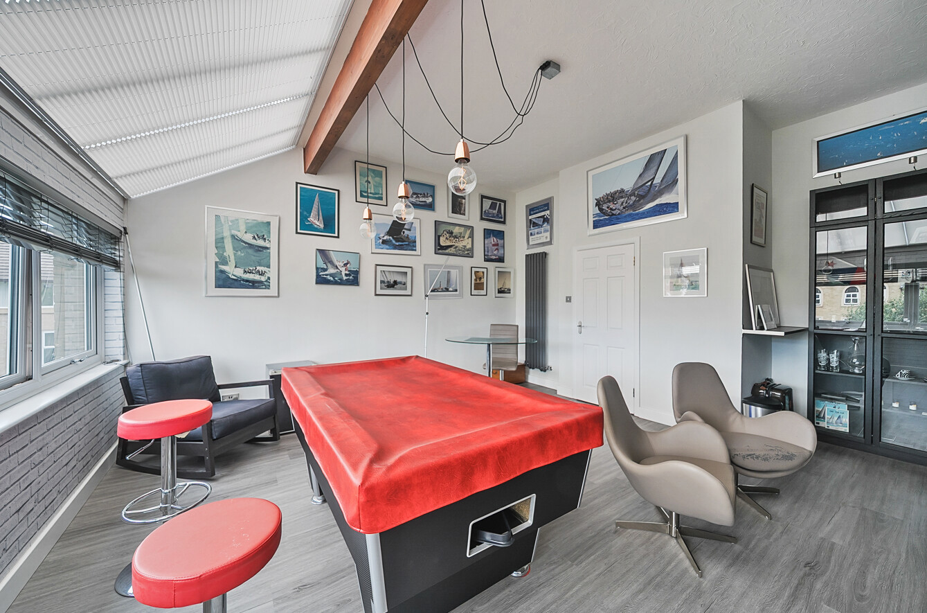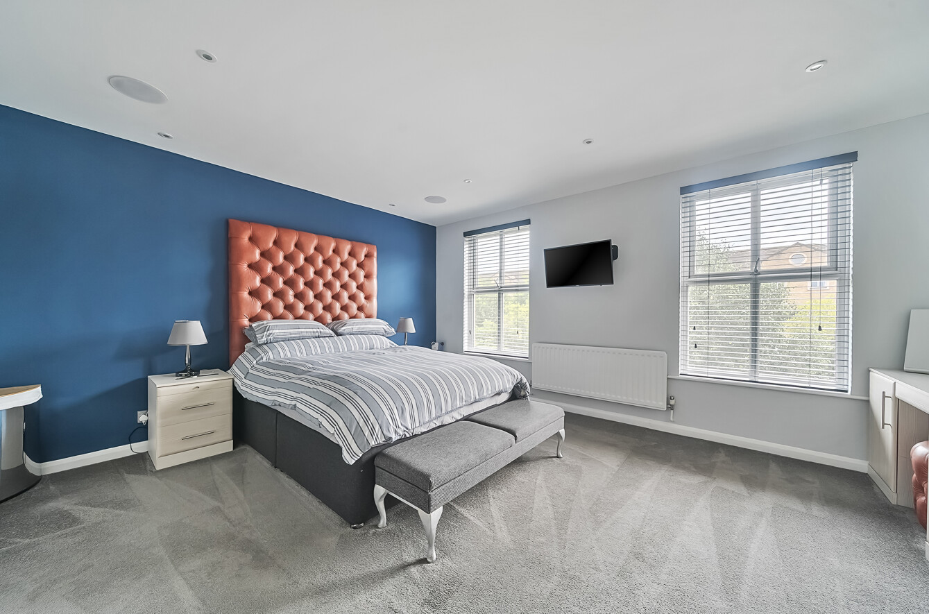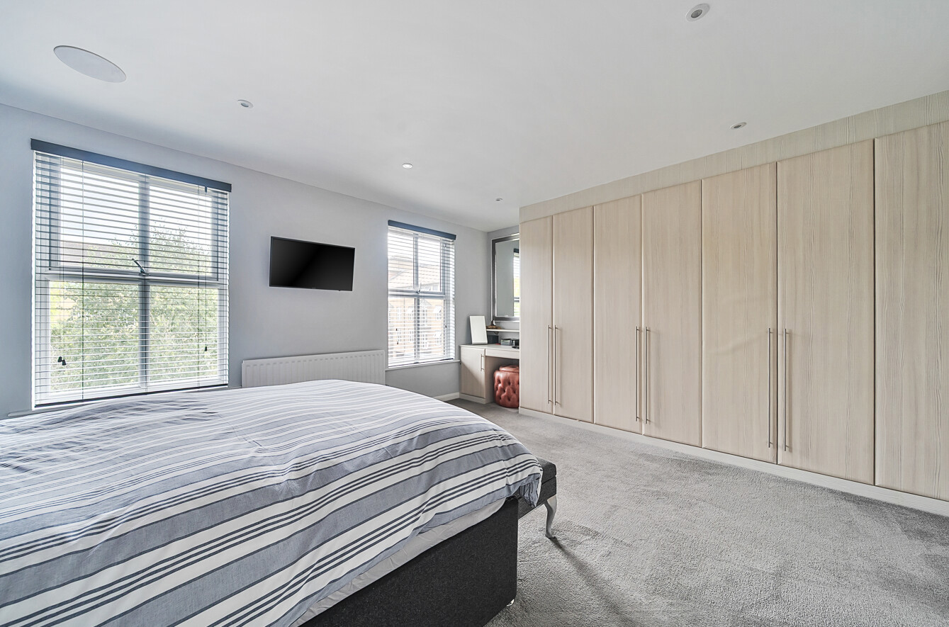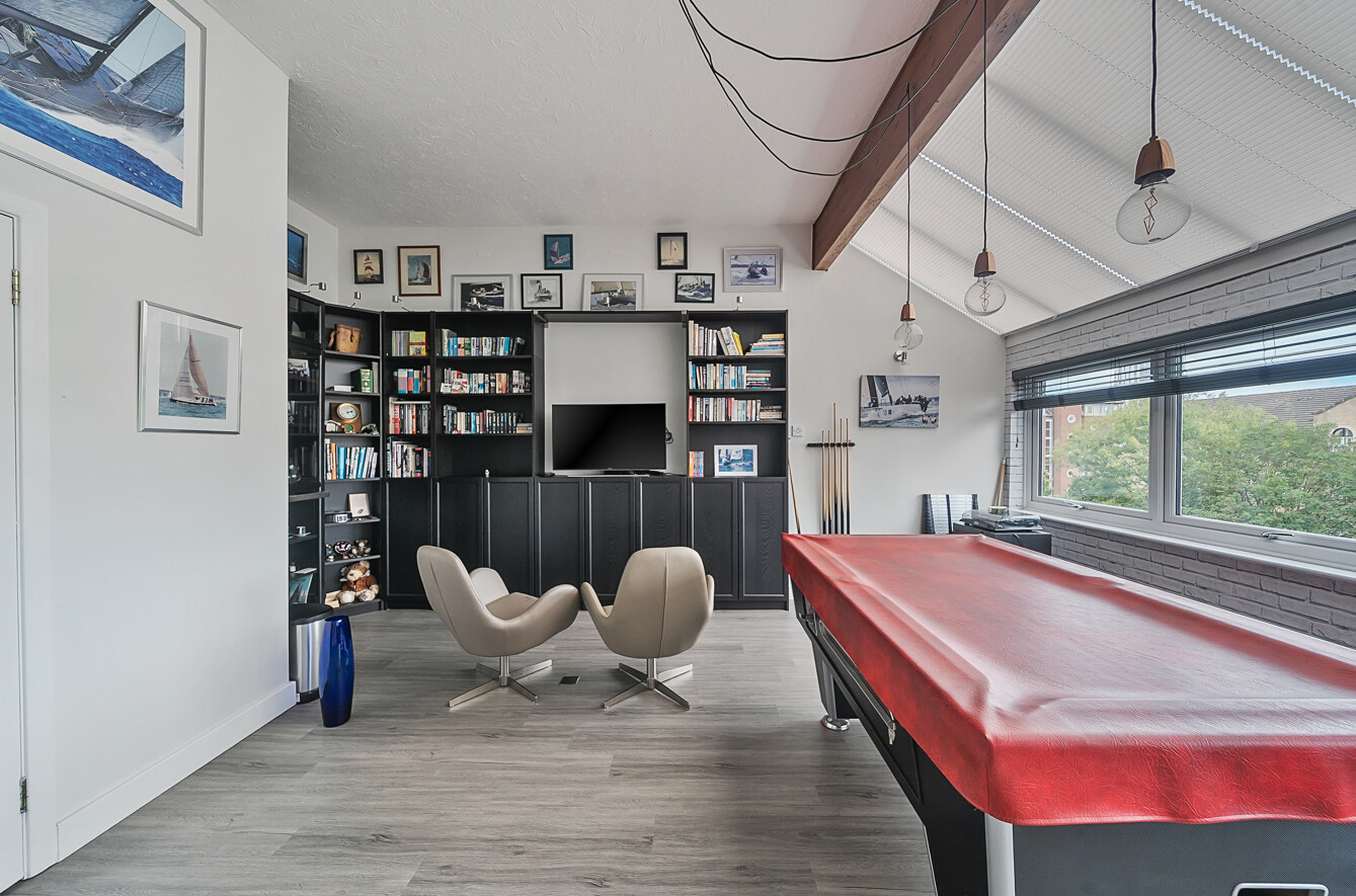 The top floor features two further generous bedrooms, both large enough for additional furnishings and currently used as an entertainment/games area. Bedroom four includes a built-in storage cupboard, and both rooms are served by a second modern family bathroom.