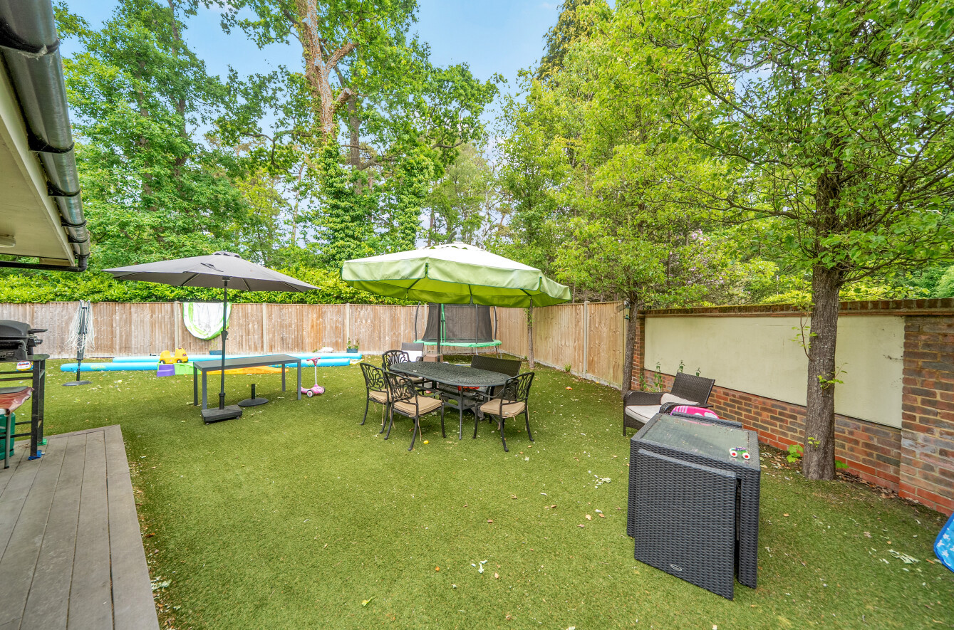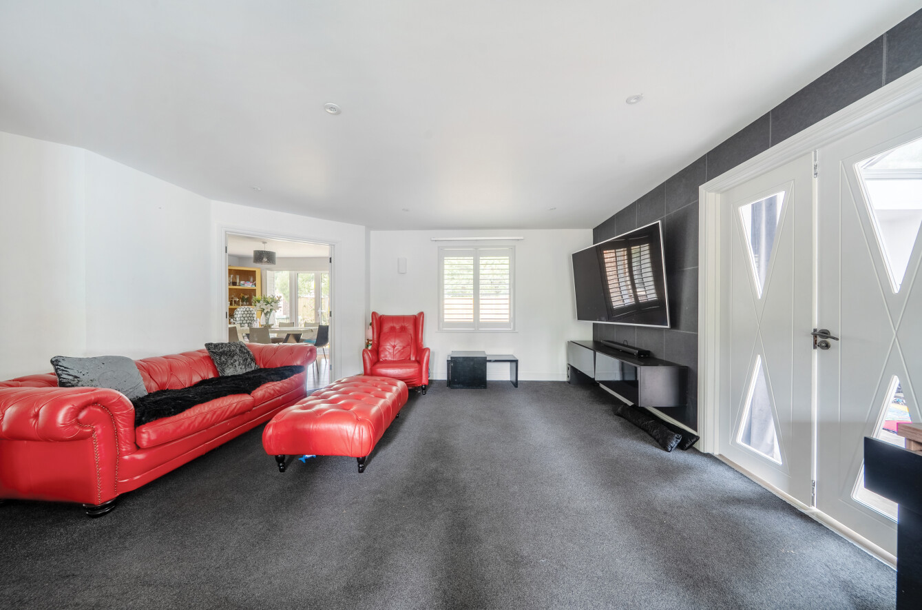 An open aspect flows through to the dining room that includes doors to the side garden while further doors lead to the spacious lounge. Here, doors allow access to the sitting room that features a vaulted glazed roof, bi-fold doors and double doors on both sides that open to the garden.