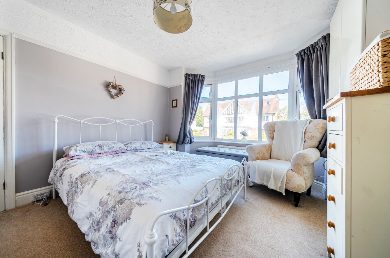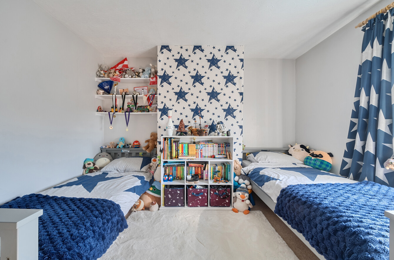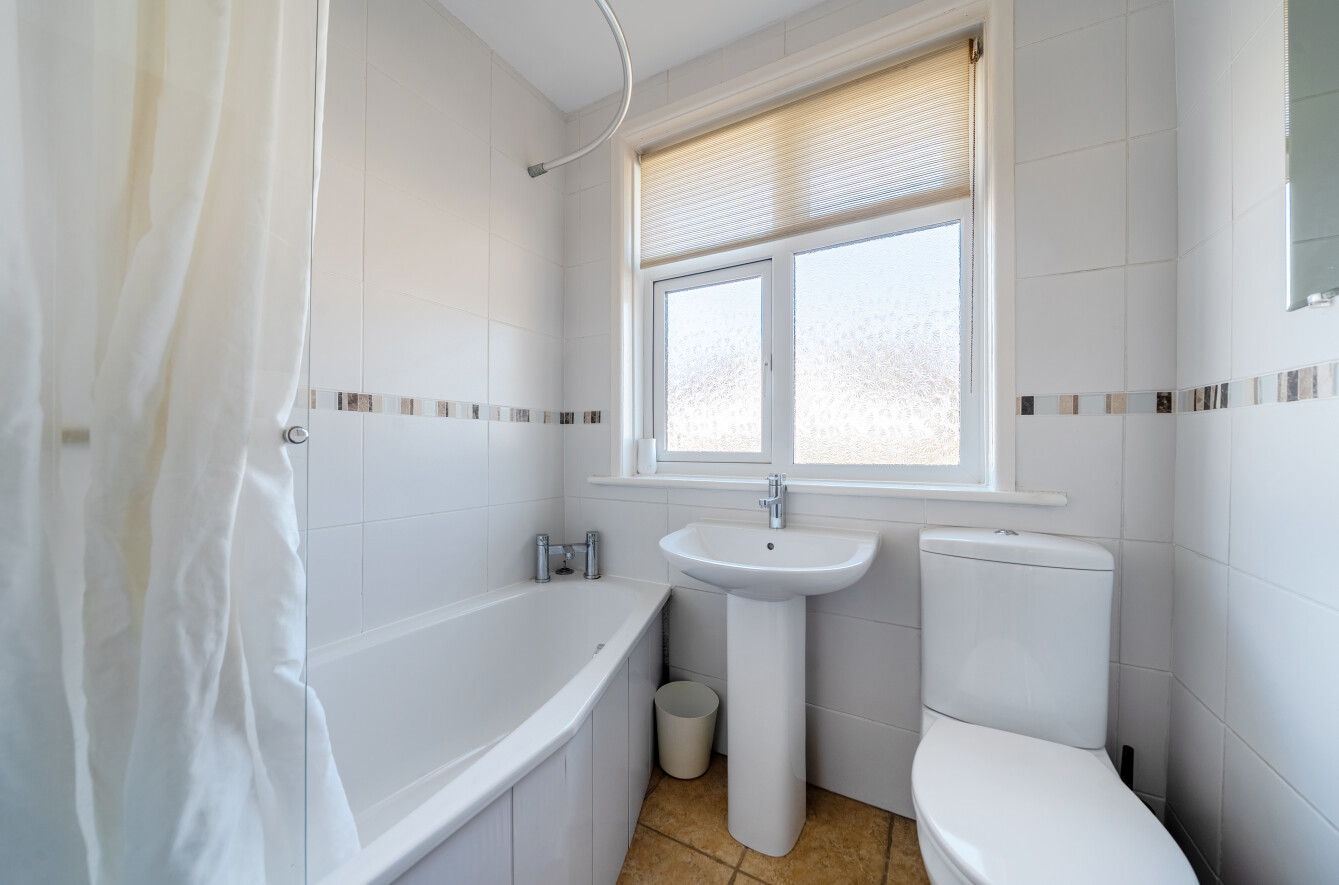 The first floor offers three well-proportioned bedrooms, comprising two generous doubles and a comfortable single. The second bedroom benefits from a charming bay window and excellent built-in wardrobes. A modern white three-piece bathroom serves all rooms on this level.