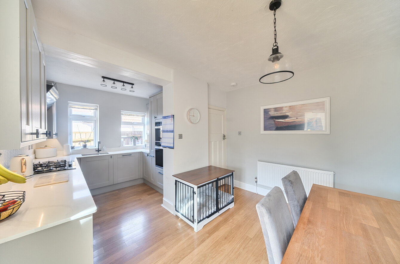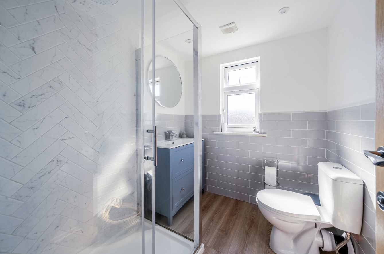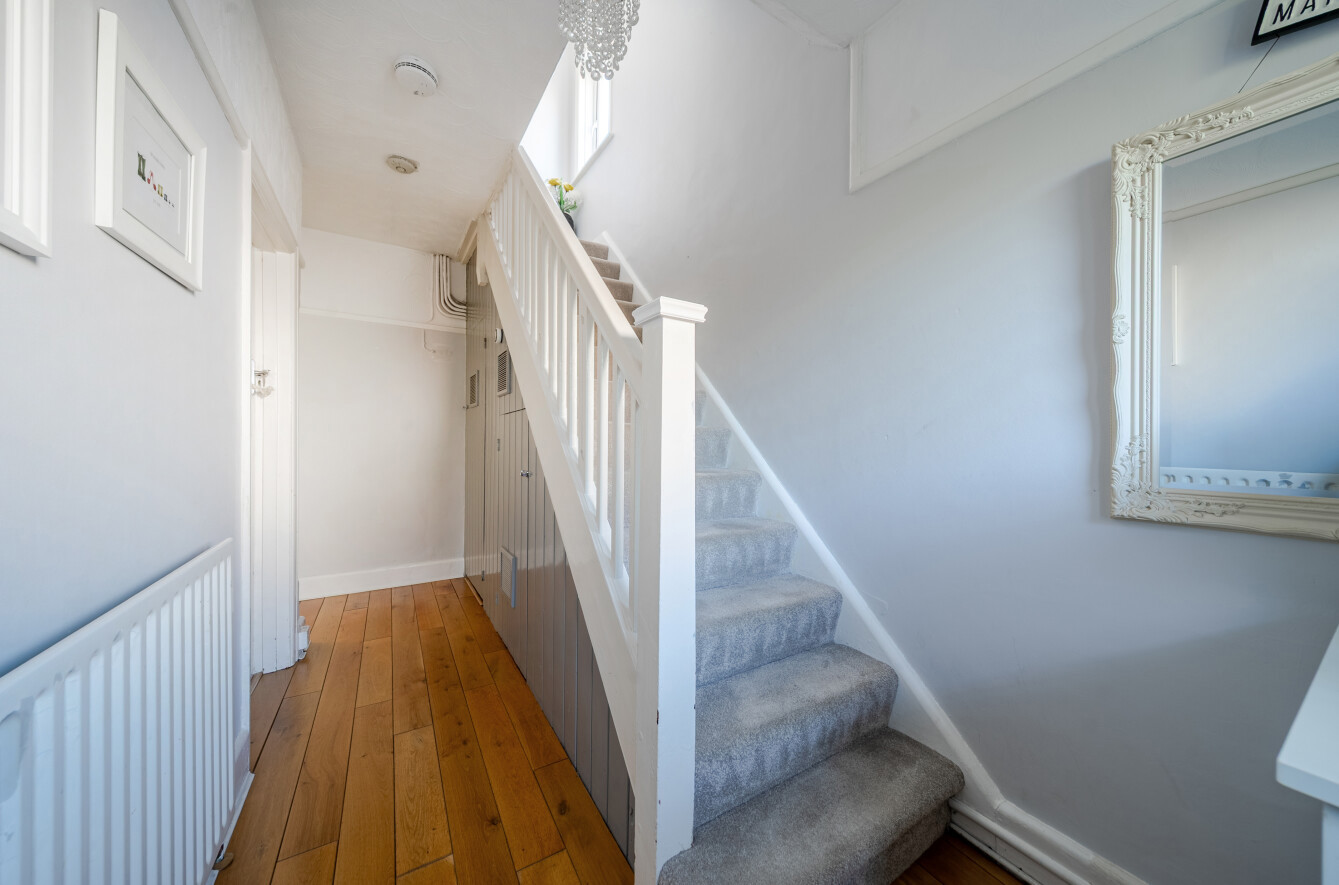 The first floor offers three well-proportioned bedrooms, comprising two generous doubles and a comfortable single. The second bedroom benefits from a charming bay window and excellent built-in wardrobes. A modern white three-piece bathroom serves all rooms on this level.