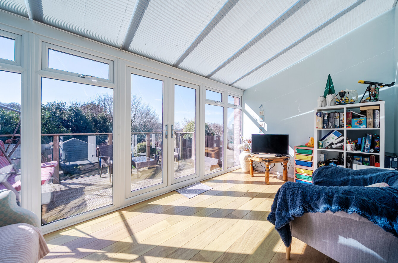 Externally, the property continues to impress with a private, enclosed south-facing rear garden. A raised decking area offers the perfect space for al fresco dining and outdoor entertaining, with direct access from the sunroom. The garden also includes a neatly maintained lawn, mature shrubs, a useful shed, and gated side access.