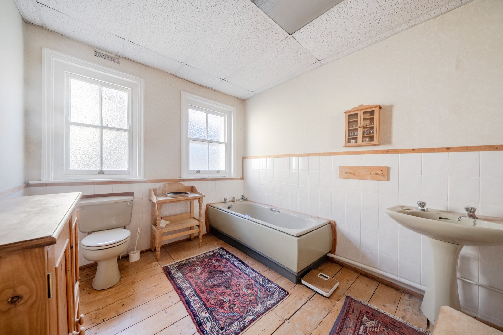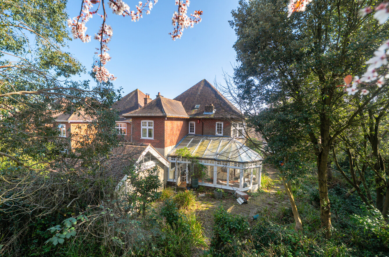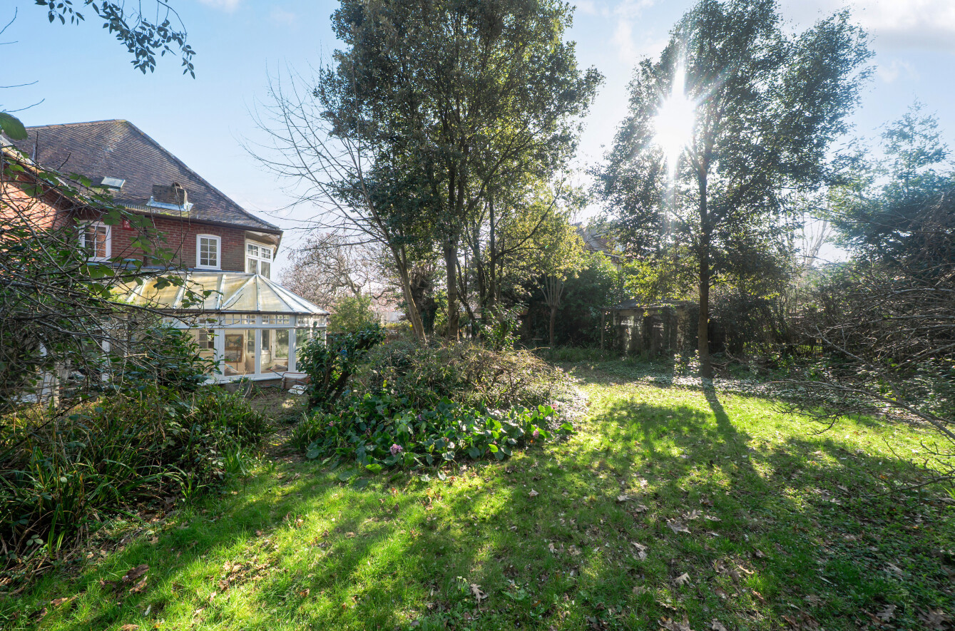 Outside the double plot creates a pleasant setting with mature shrubs and trees ensuring a good degree of privacy. The driveway provides off road parking for several vehicles and the garage is found to the rear of the house with a high level pine lined vaulted ceiling, an inspection pit and a small lean-to. There is an old summerhouse in the top left corner and a small studio on the left boundary.
