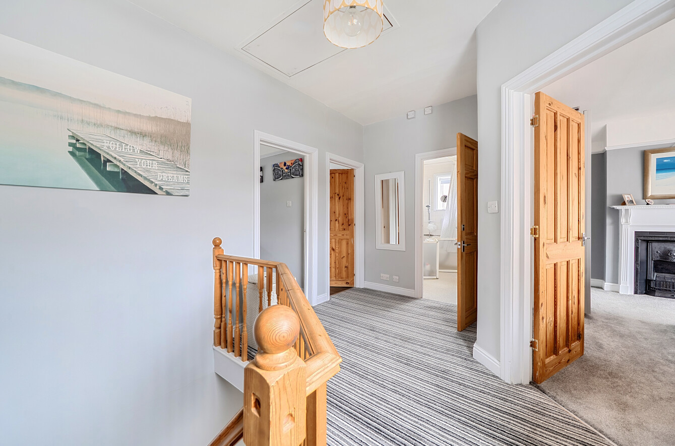 The spacious first-floor landing provides access to the high-pitched loft space and doors to three generously sized double bedrooms, all served by the well-appointed family shower room.