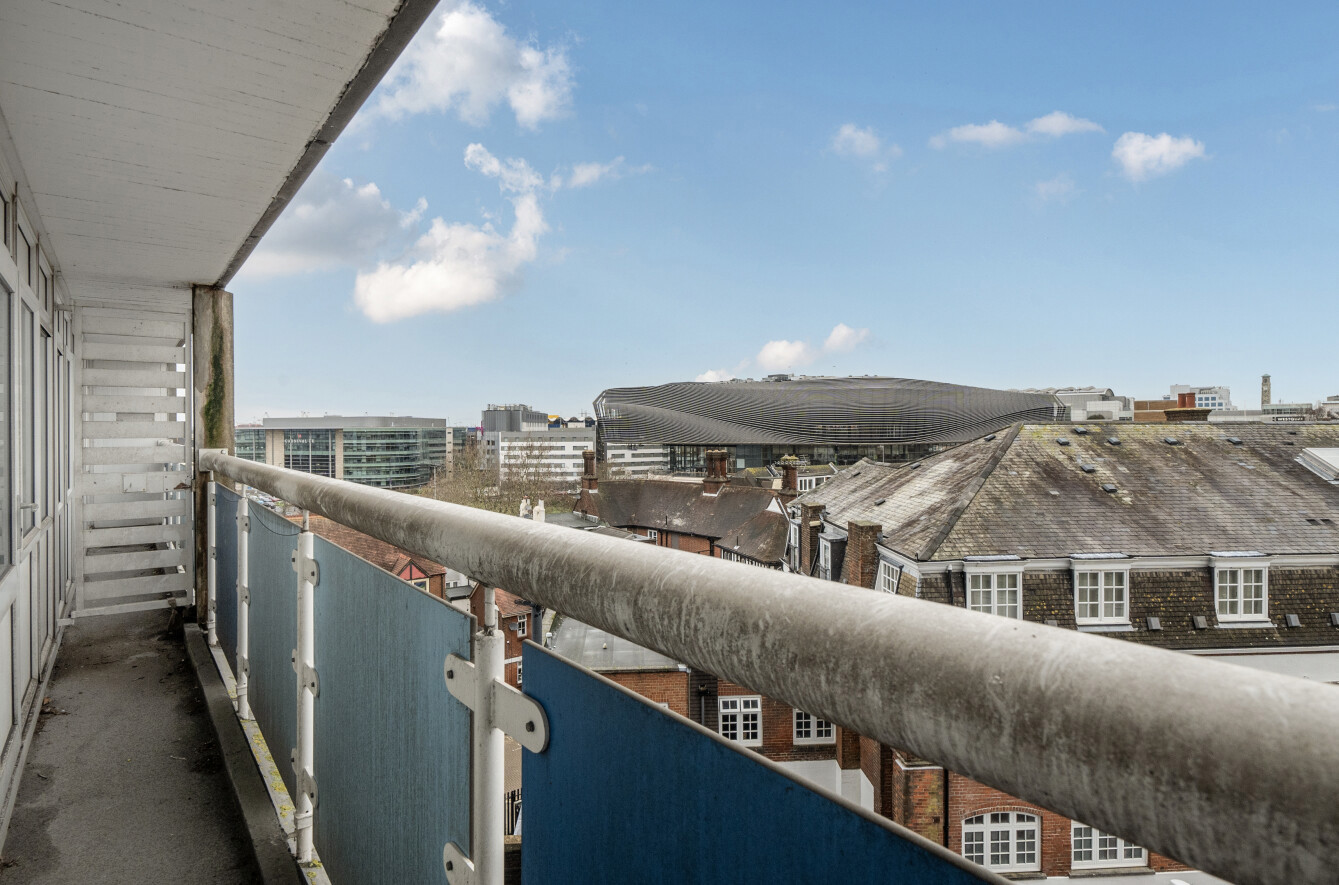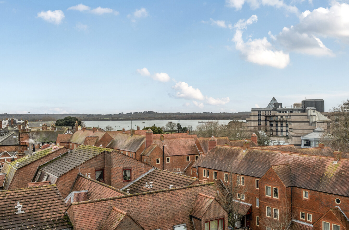 Flooded with natural light from dual-aspect windows, the front of the apartment features an open-plan, L-shaped living area with contemporary wooden flooring. From here, you can step directly onto the first balcony, which offers far-reaching views across the city and towards Southampton Water. Adjacent to the living space is a generously sized fitted kitchen, equipped with a range of wall and base units, integrated appliances, and additional space for freestanding ones.