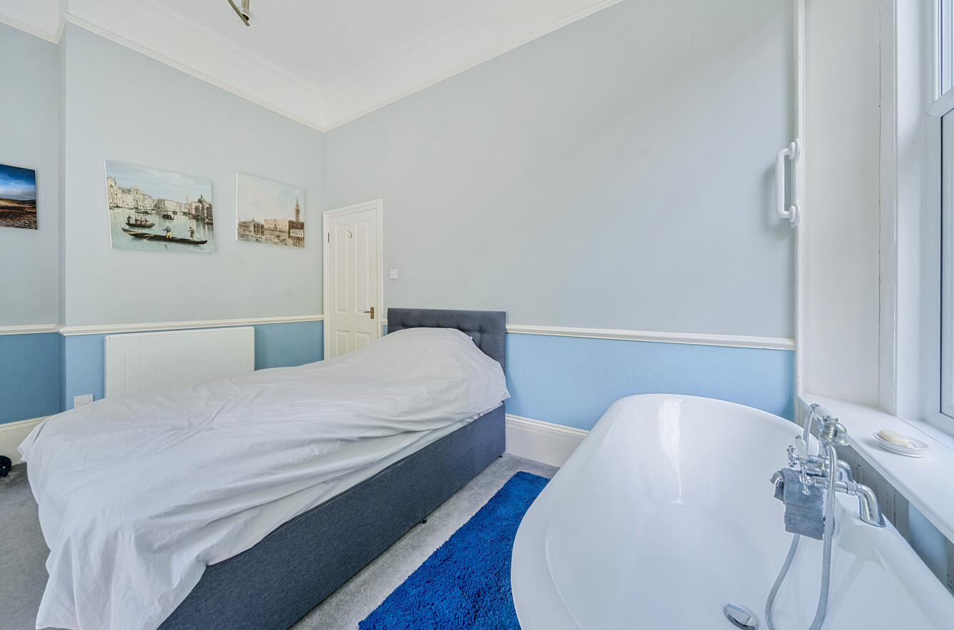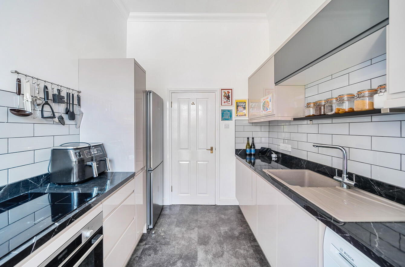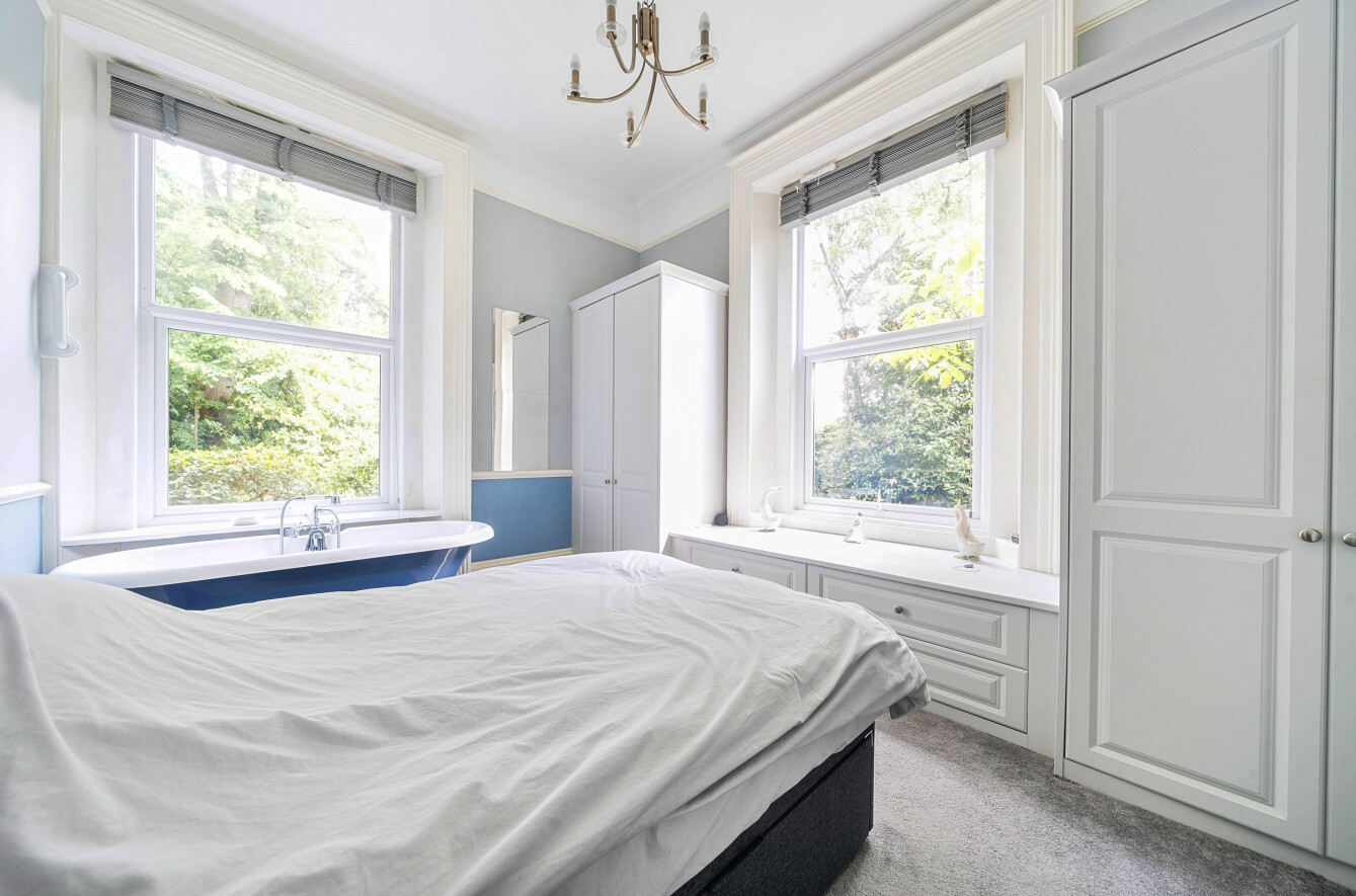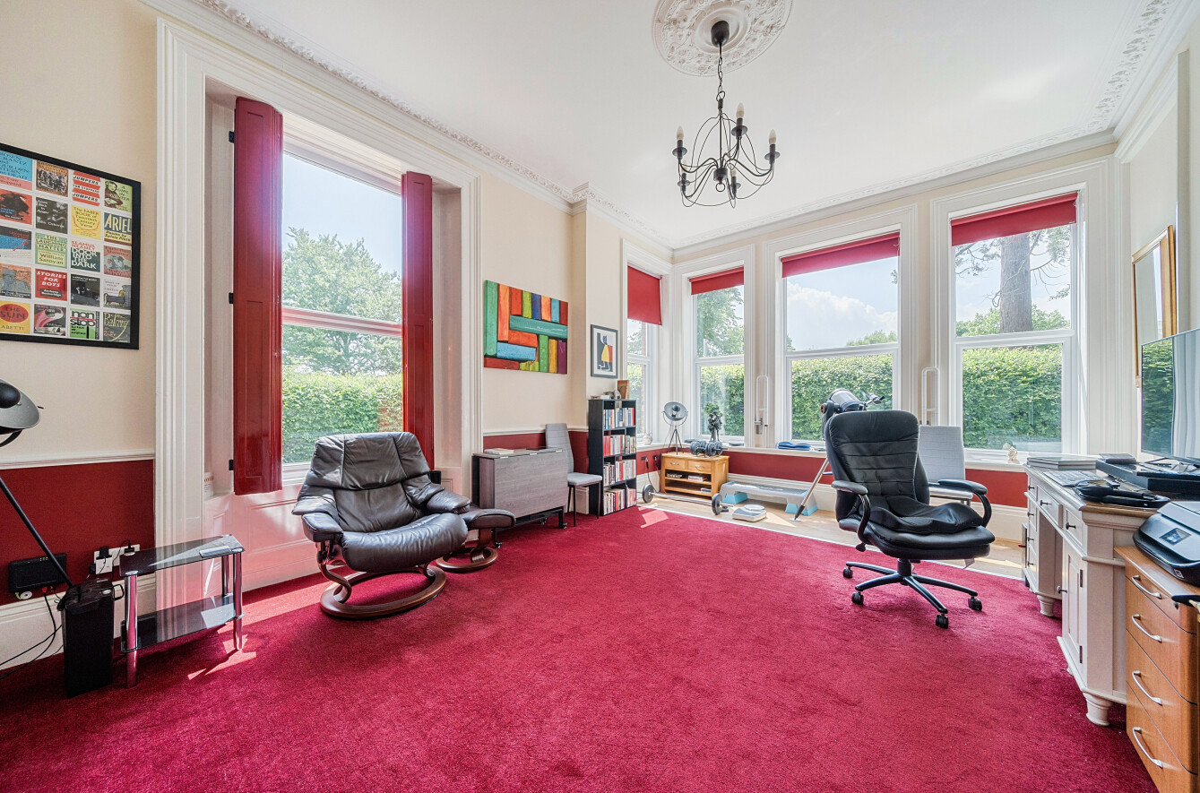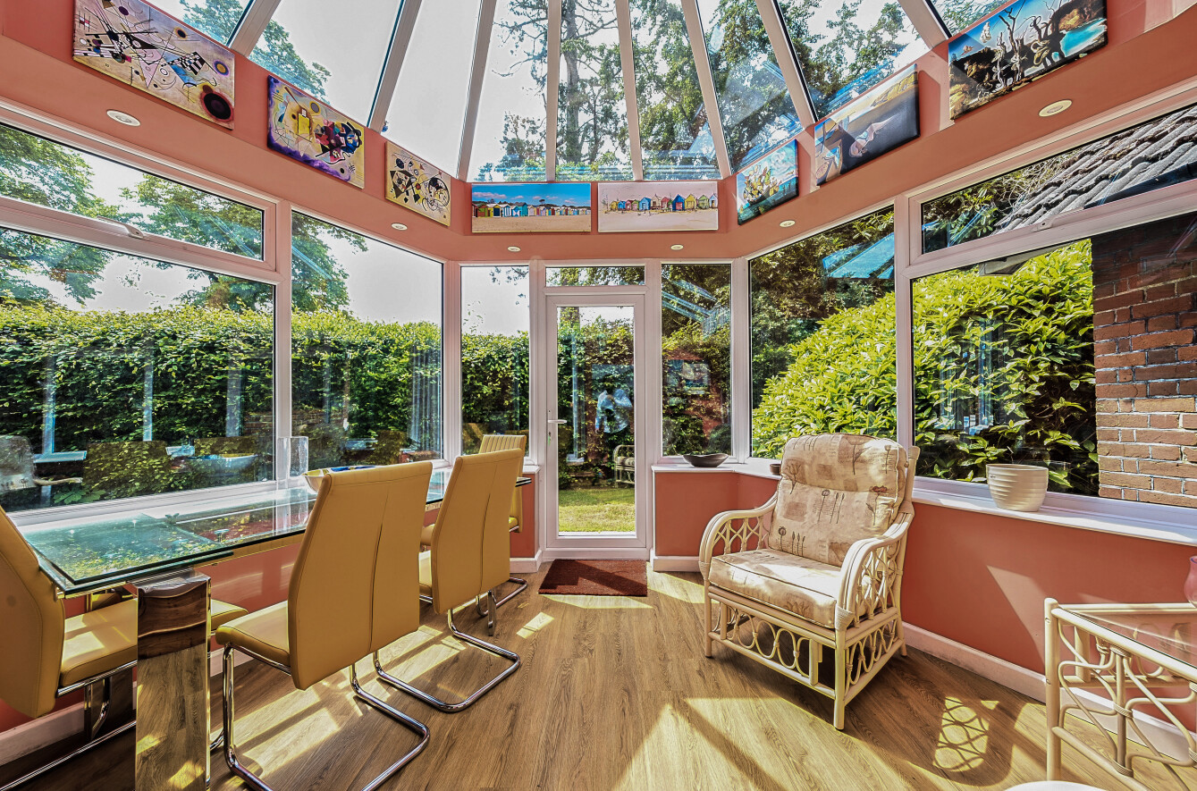 The kitchen has been modernised to a high standard with an abundance of wall and base storage units alongside ample worktop surface space, perfect for all food preparation. Leading off the kitchen is a bright sunroom, offering a versatile space that can be used as a dining area, study, or additional living room. A single French door opens onto the garden, creating a seamless indoor–outdoor flow that’s perfect for entertaining.
