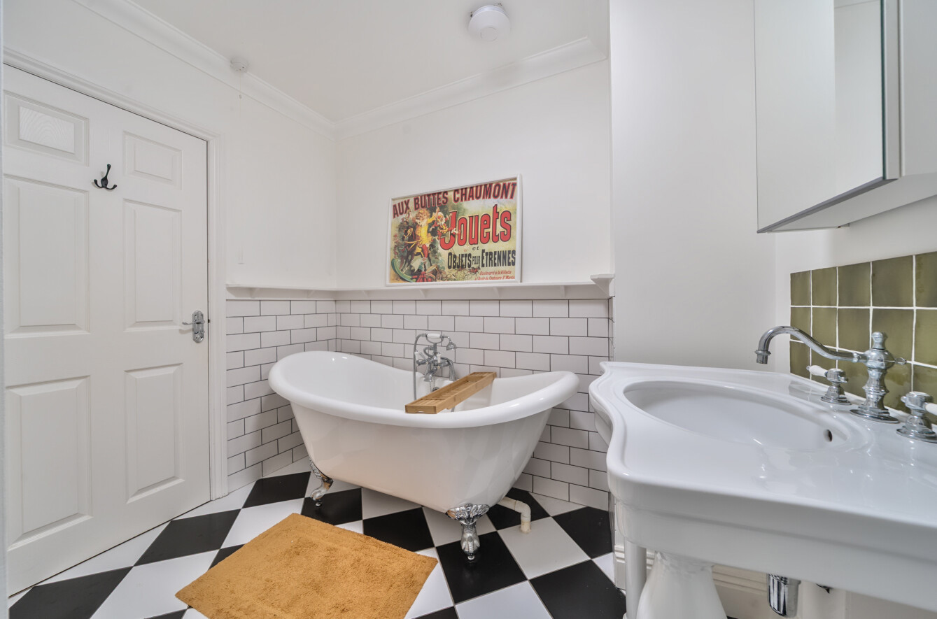 Both bedrooms are generously proportioned and complemented by two beautifully appointed bathrooms: a stylish three-piece shower suite and an elegant second bathroom featuring a classic roll-top bathtub.