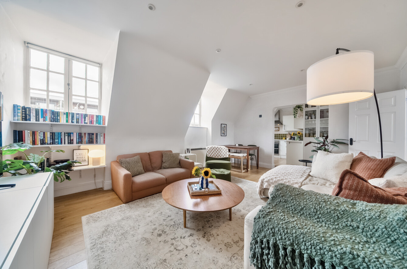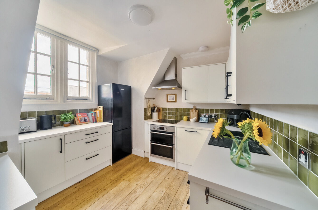 The kitchen features ample storage and generous worktop space, perfect for cooking and hosting. The adjoining living area is bathed in natural light from multiple windows, creating a bright and airy atmosphere throughout.