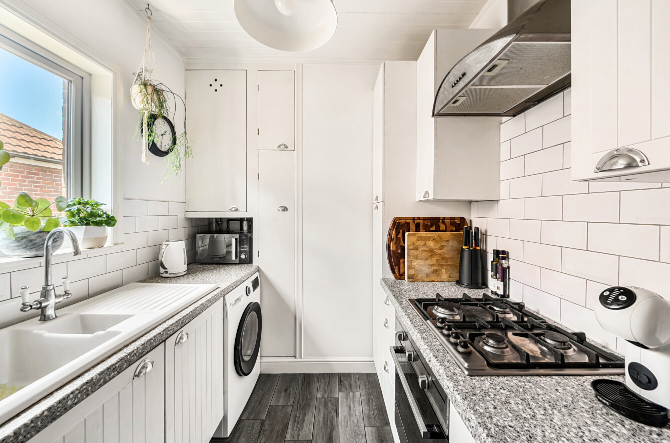 The thoughtfully designed galley kitchen offers plenty of counter space and an abundance of storage cupboards perfect for keen cooks or those who love to entertain.