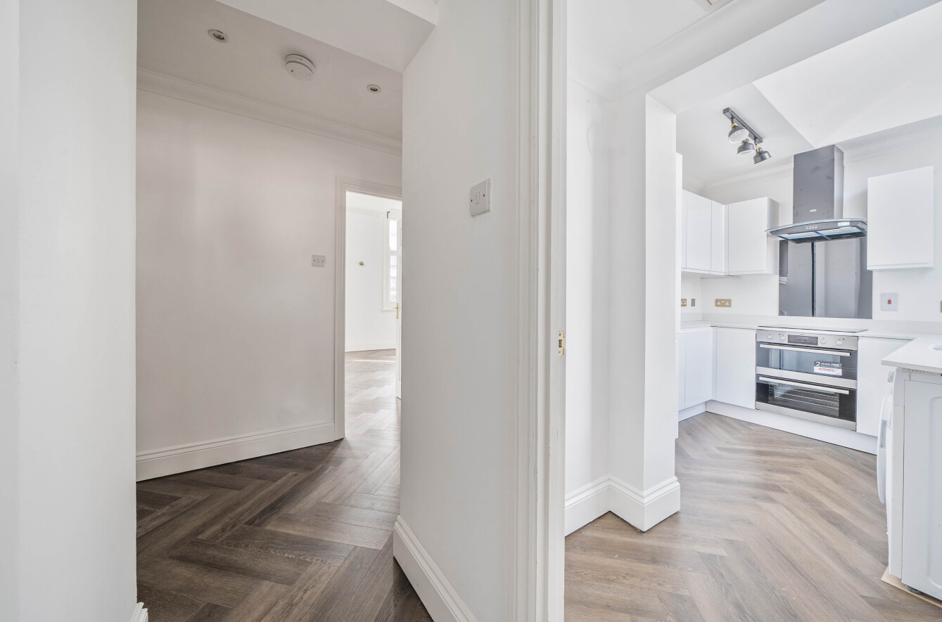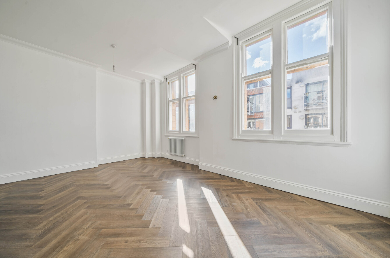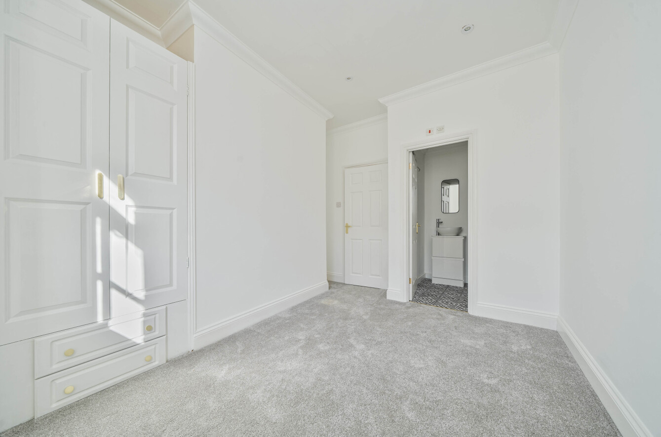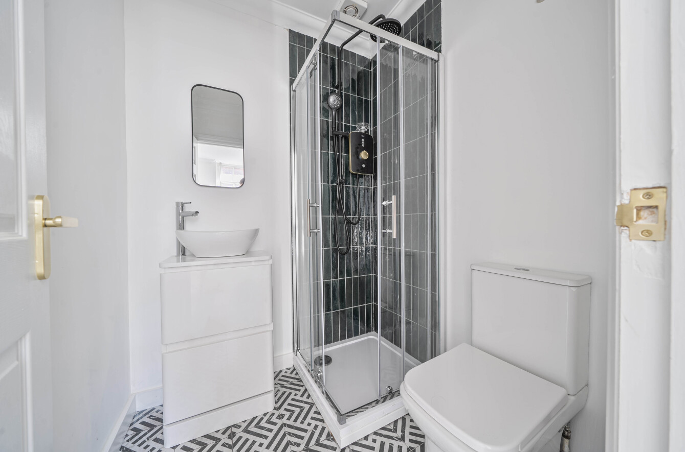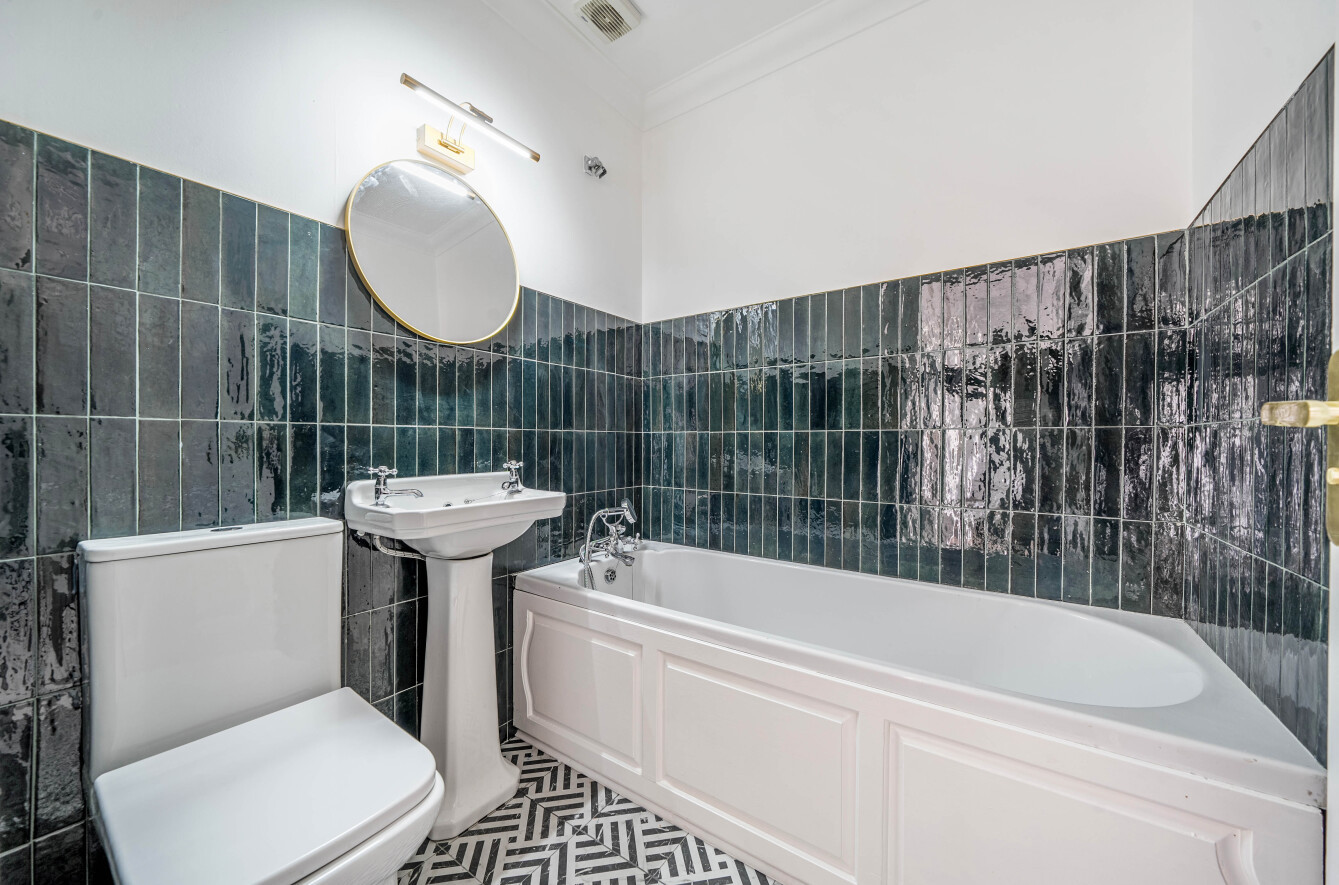 Further features of the property include a brand new handleless integrated kitchen in gloss white with Quartz Stone worktop and upstands, a ceramic under-mounted kitchen sink, and a brand new AEG appliance pack including double under oven, hob, and extractor fan with 2-year warranty. Smoked dark oak style herringbone parquet flooring runs throughout the living room, hall, and kitchen, while WiFi-operated cast iron style electric radiators are fitted in each room. The new en suite has a minimal design featuring vertical stacked shower tiles and geometric floor tiles. The newly fitted bathroom comprises stacked tiles that surround the room and a geometric floor tile in the same design.