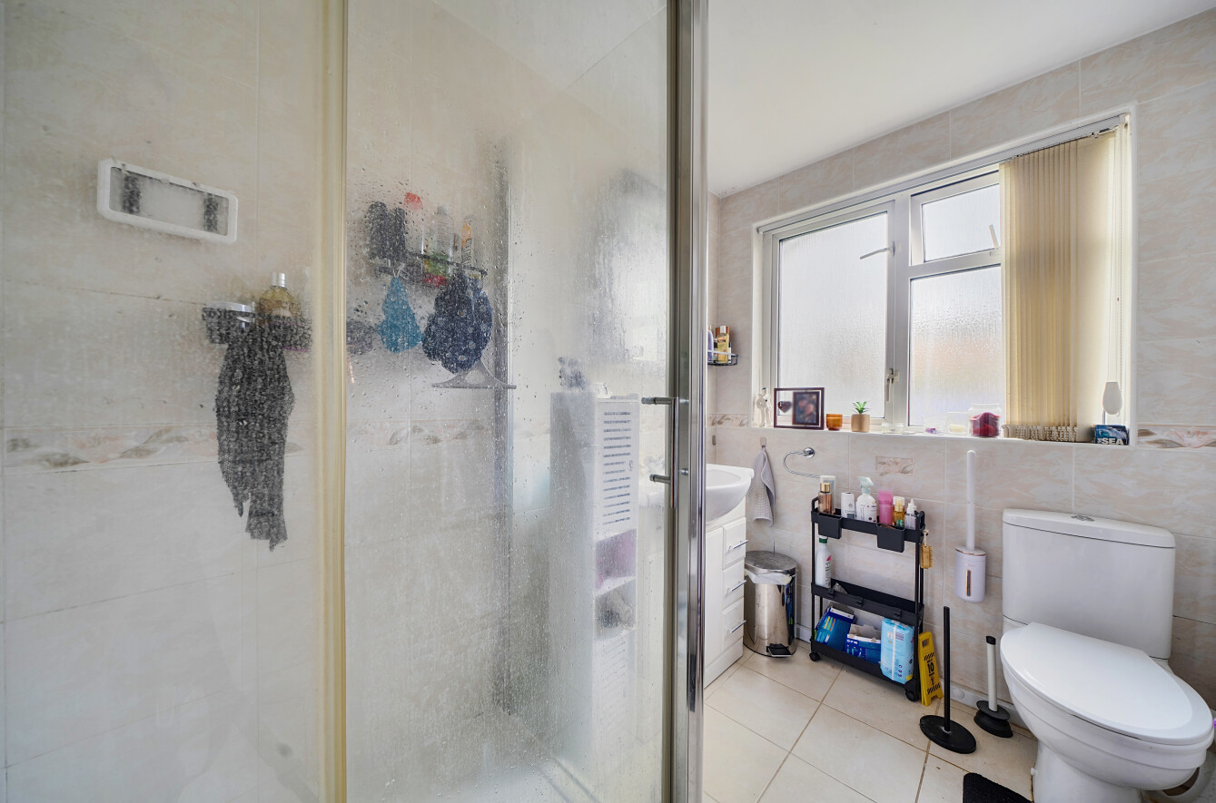 The shower room is finished with a modern three-piece suite, comprising a corner shower enclosure with wall-mounted shower, low-level W.C, and vanity sink unit.