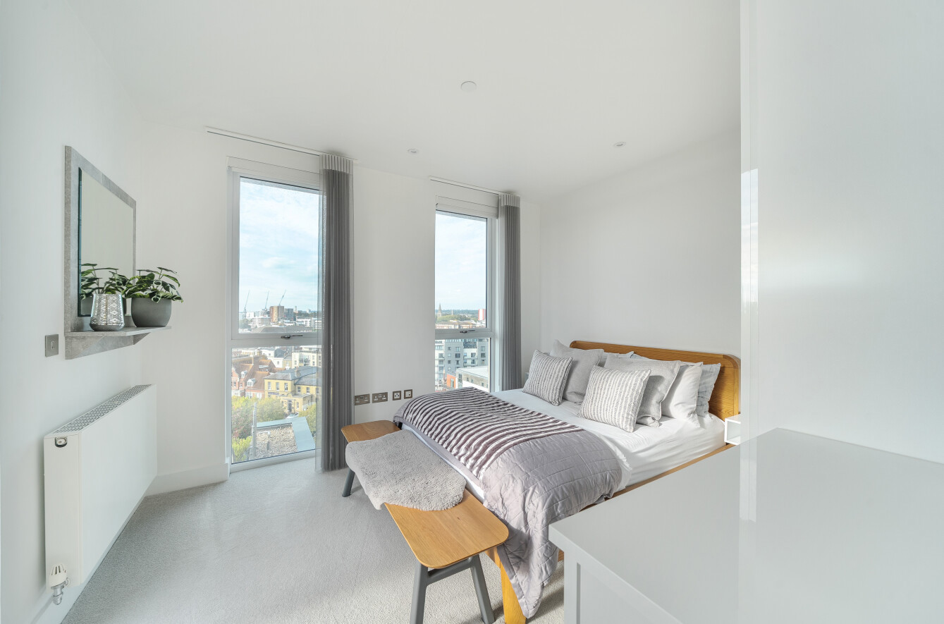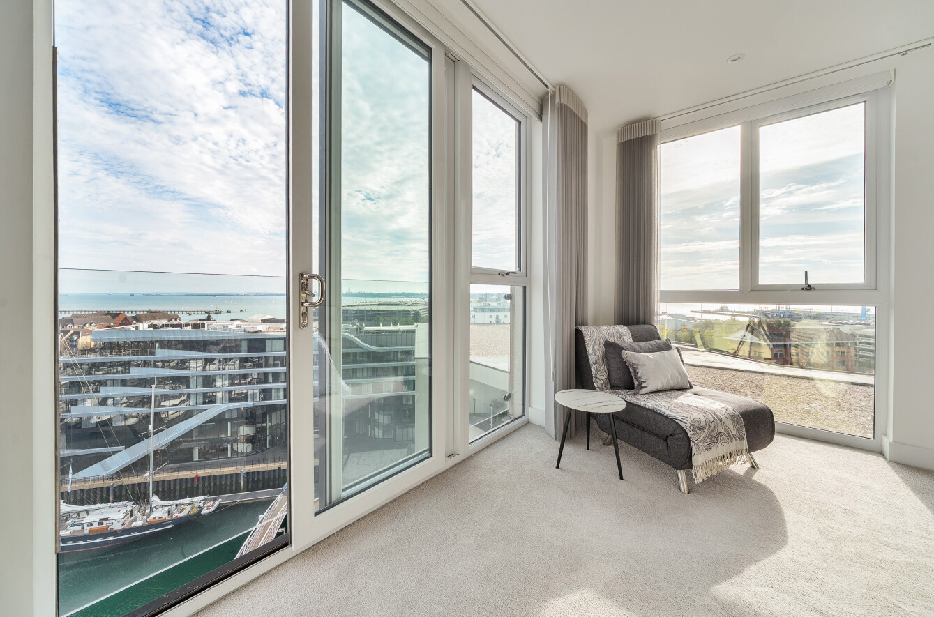 The second bedroom, also a double, features fitted wardrobes, superb city views, and access to the expansive 9th floor roof terrace with sweeping vistas across the marina and down Southampton Water. A well-appointed family bathroom completes this level.