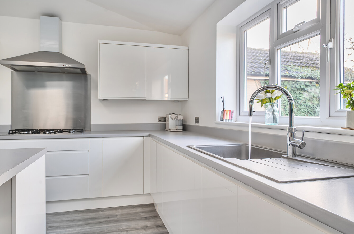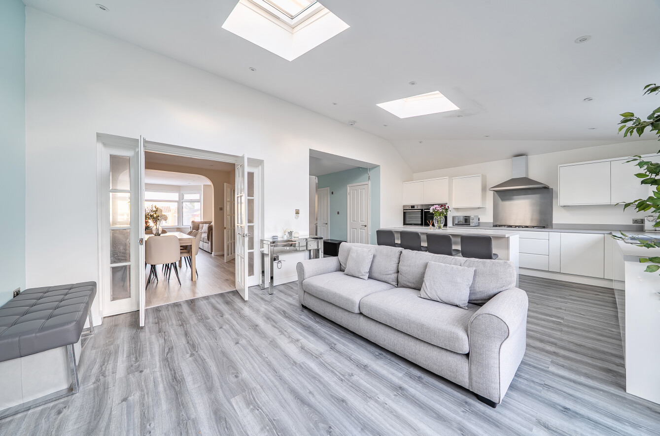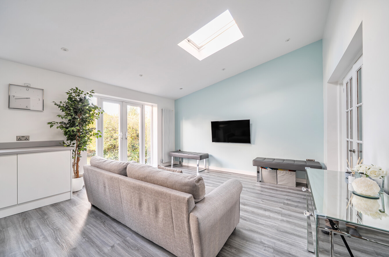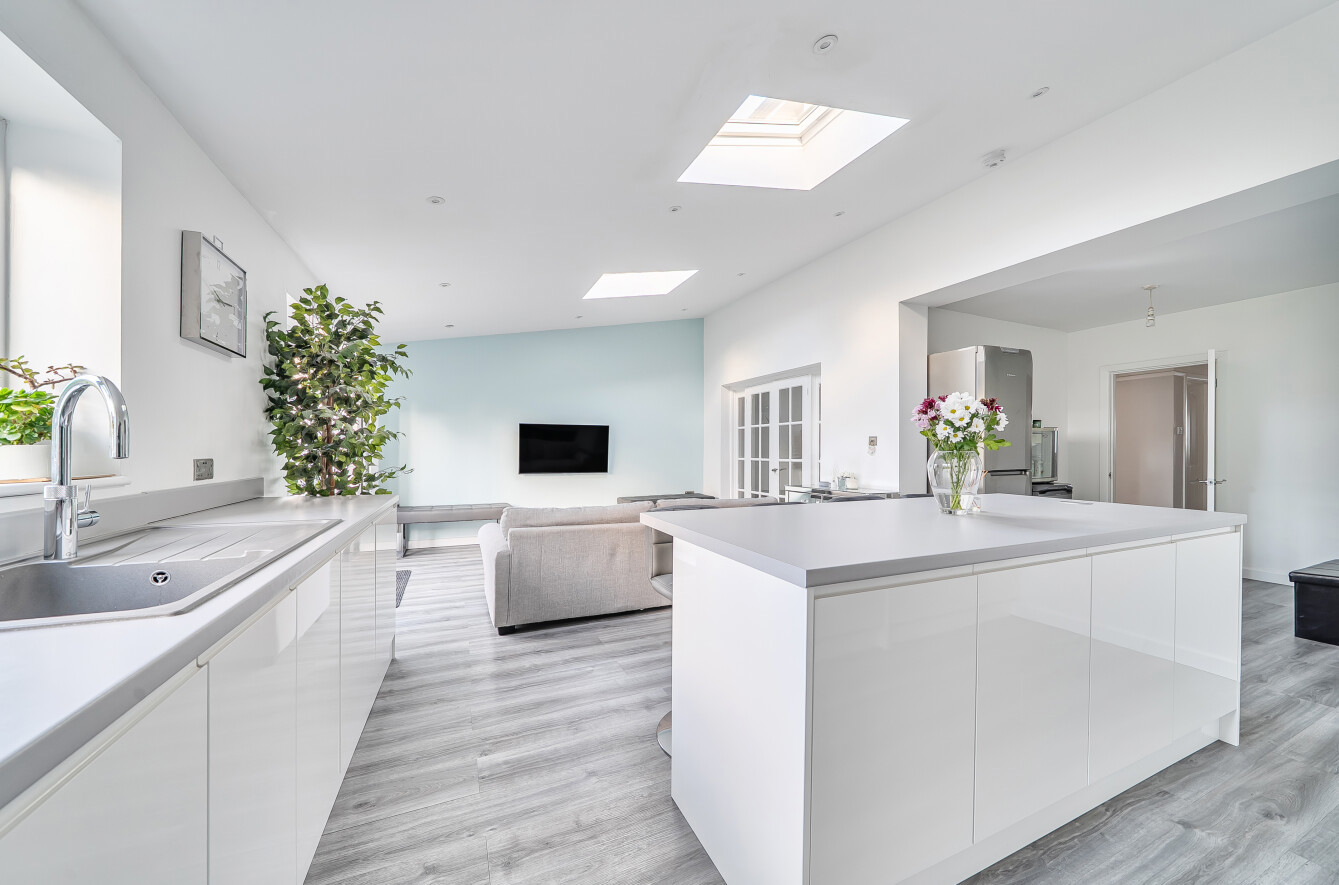 The main feture of the home is a stunning open-plan kitchen and dining area. This impressive space is ideal for entertaining, boasting a large island, excellent storage, integrated appliances, and French doors opening onto the garden.