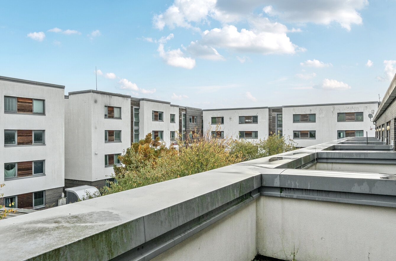 The second floor features two further bedrooms, including a generous principal bedroom with fitted wardrobes and a contemporary en-suite shower room. From the landing, there is direct access to a west-facing roof terrace — an ideal spot to enjoy the afternoon sun and views across the communal gardens.