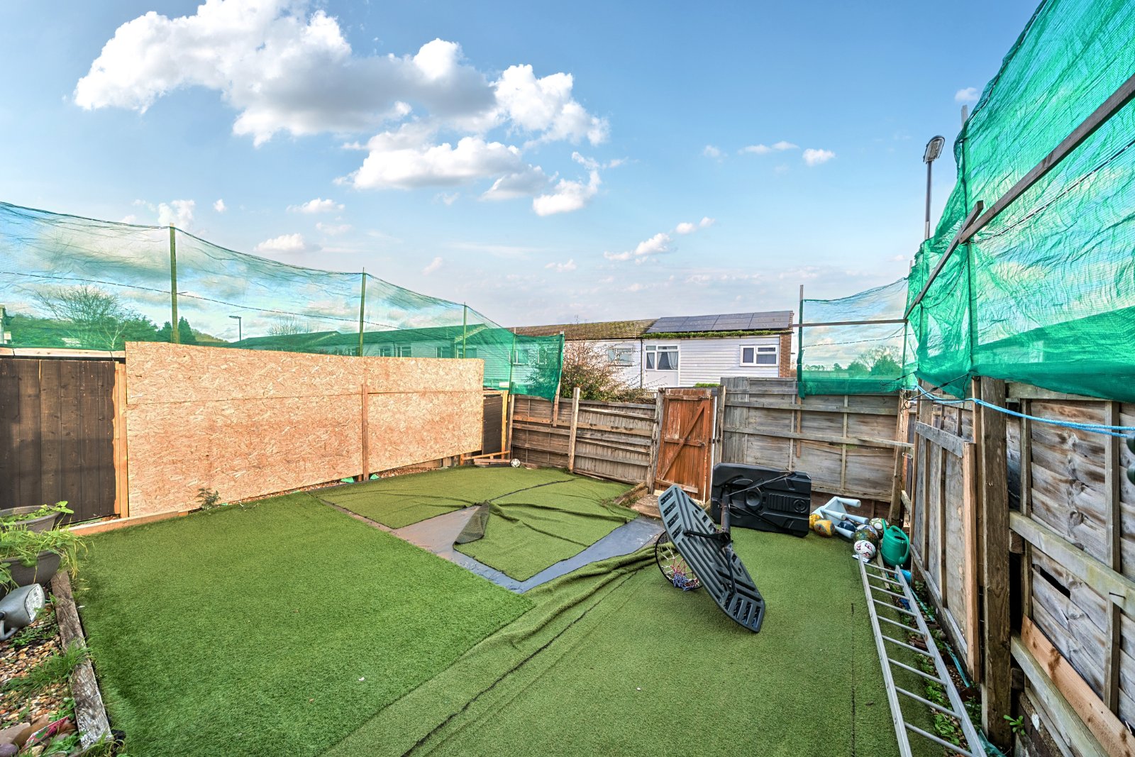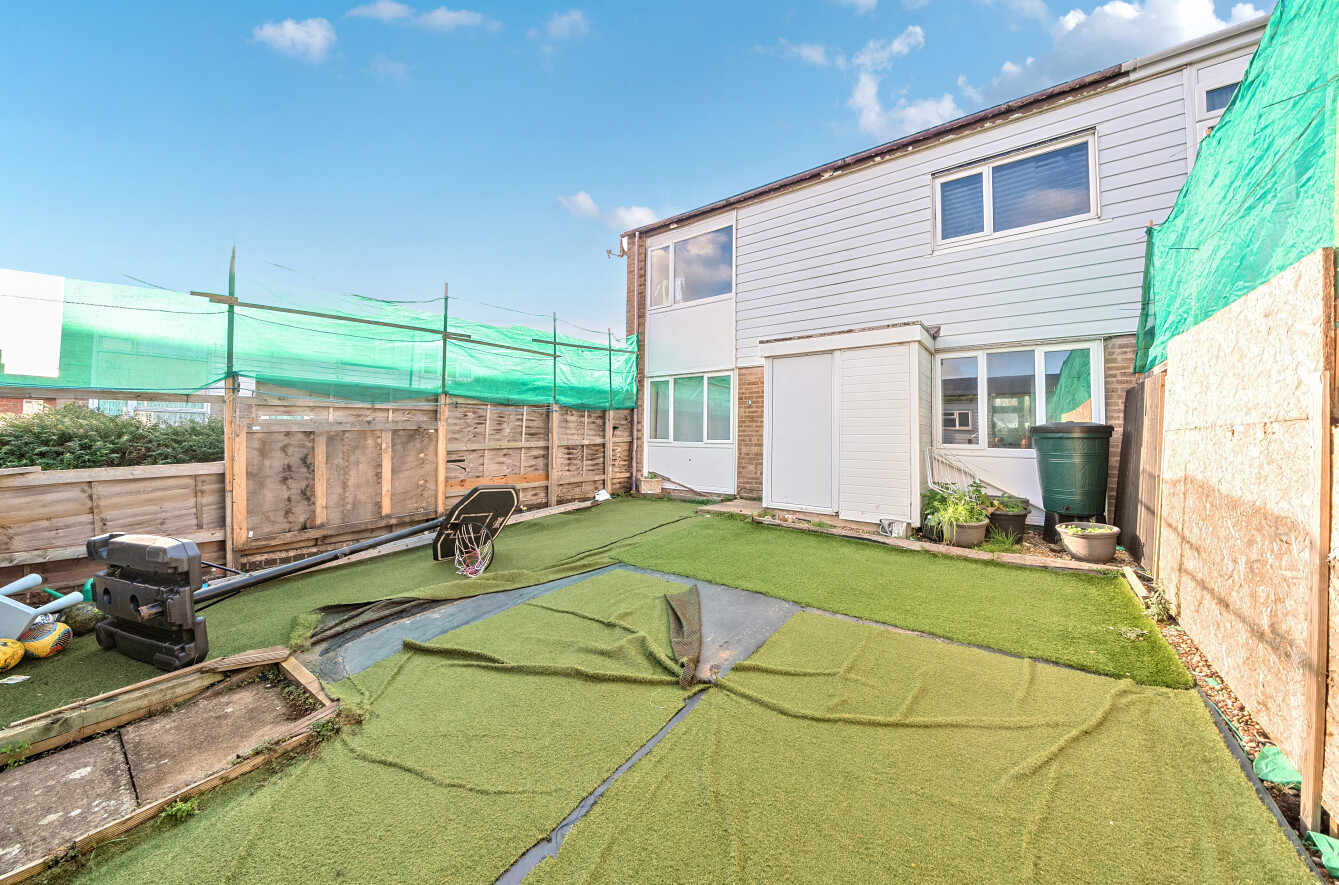 The rear garden is fully enclosed, with artificial grass and rear access.