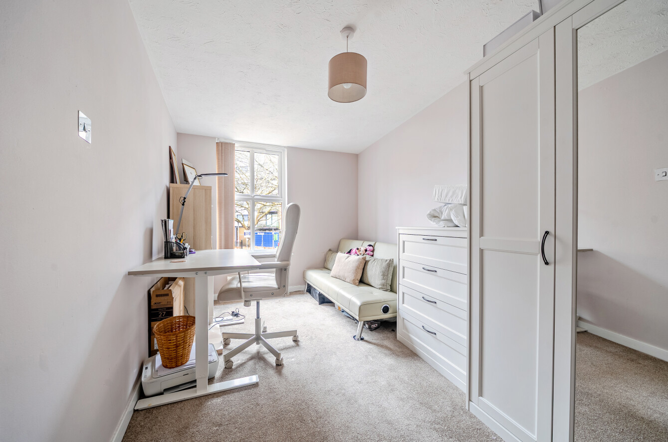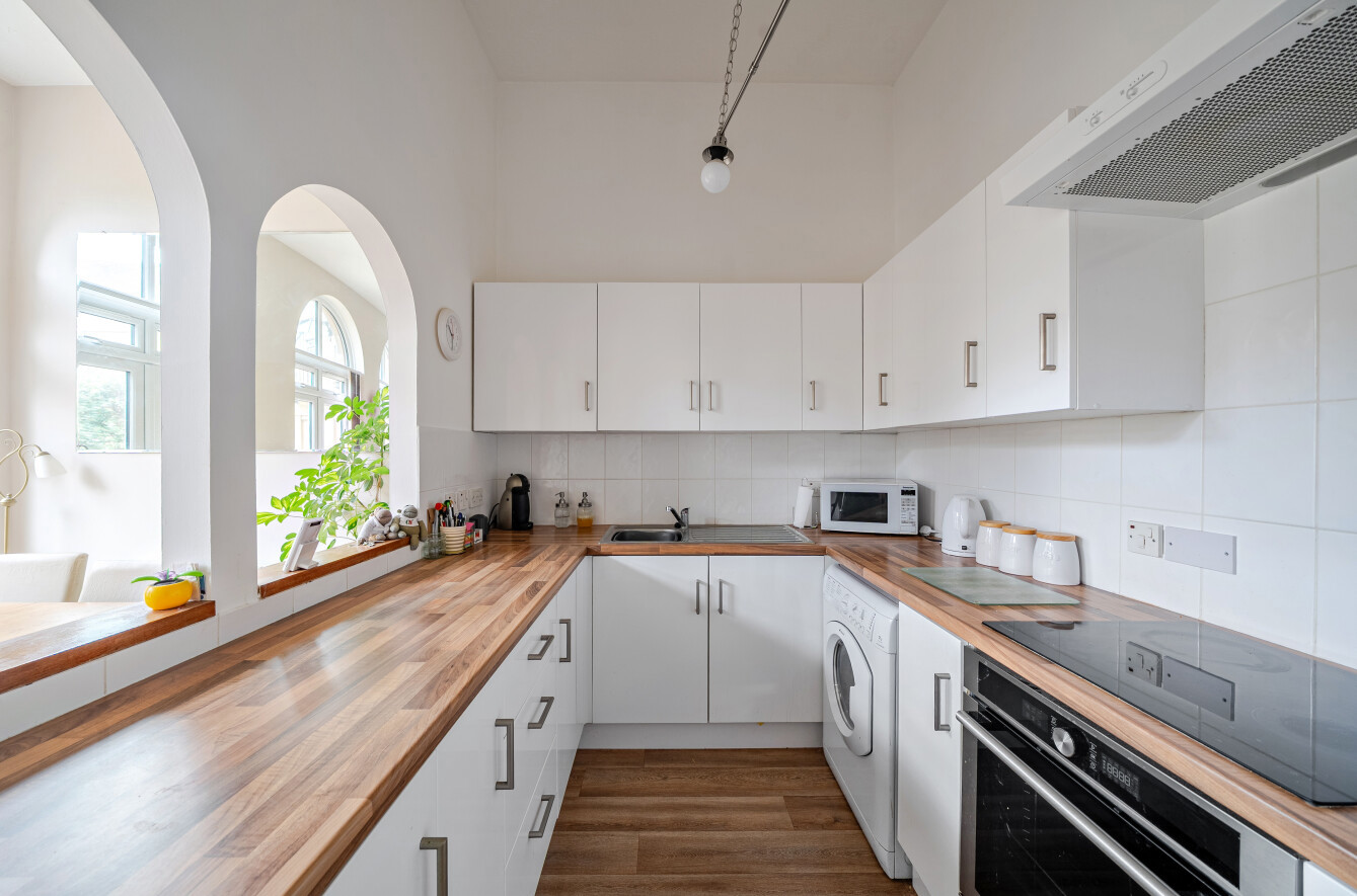 Adjoining the living area is a fully fitted kitchen, perfectly positioned for hosting guests. It offers a range of fitted storage units, integrated appliances, and space for additional freestanding appliances. The family bathroom serves both bedrooms and comprises a three-piece suite including a panelled bath, low-level WC, and pedestal wash basin.