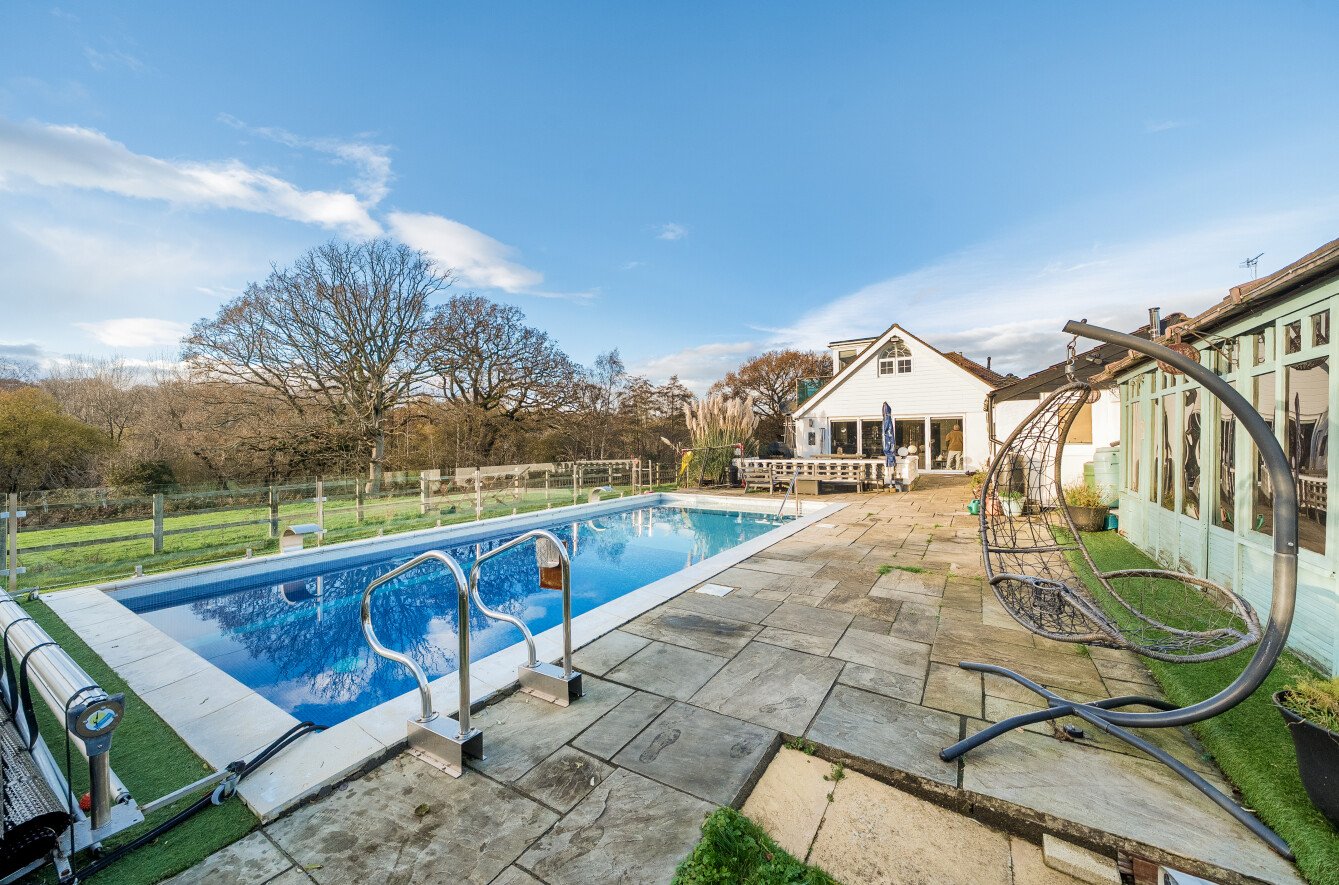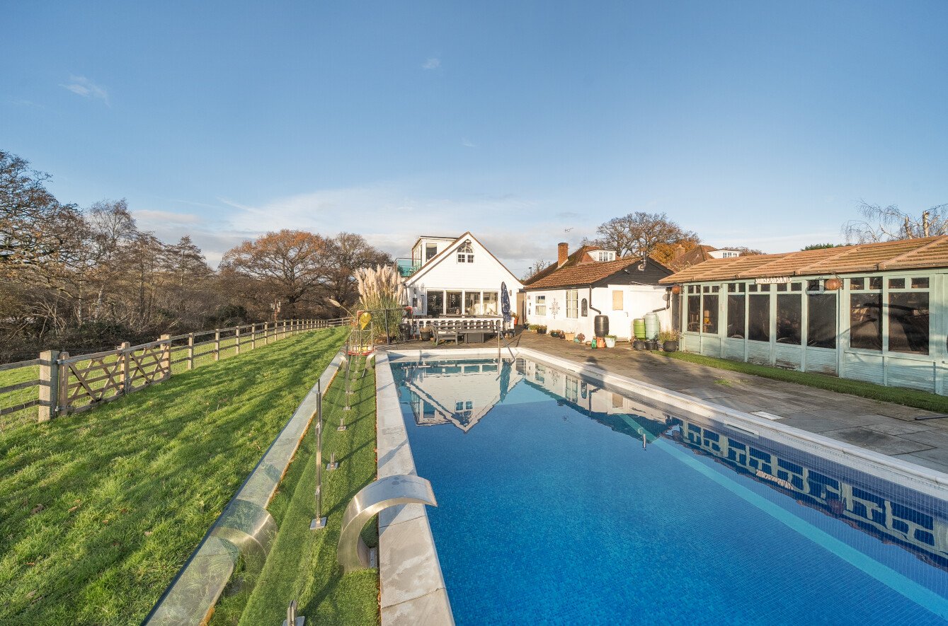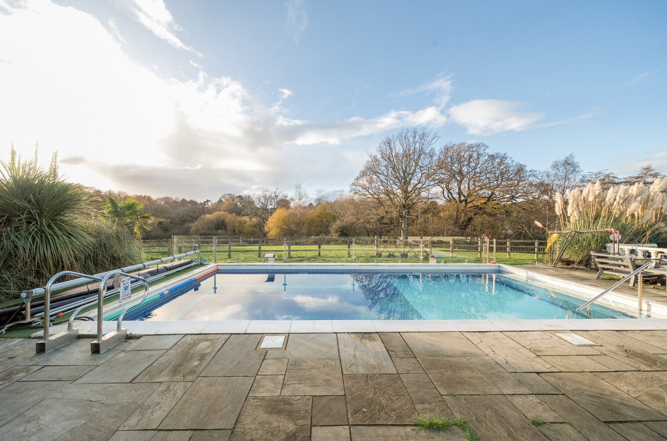 The sun-soaked rear garden provides the perfect setting for entertaining, with patio and lawn areas and a heated swimming pool, all overlooking neighbouring fields to enhance the feeling of being on holiday every day.